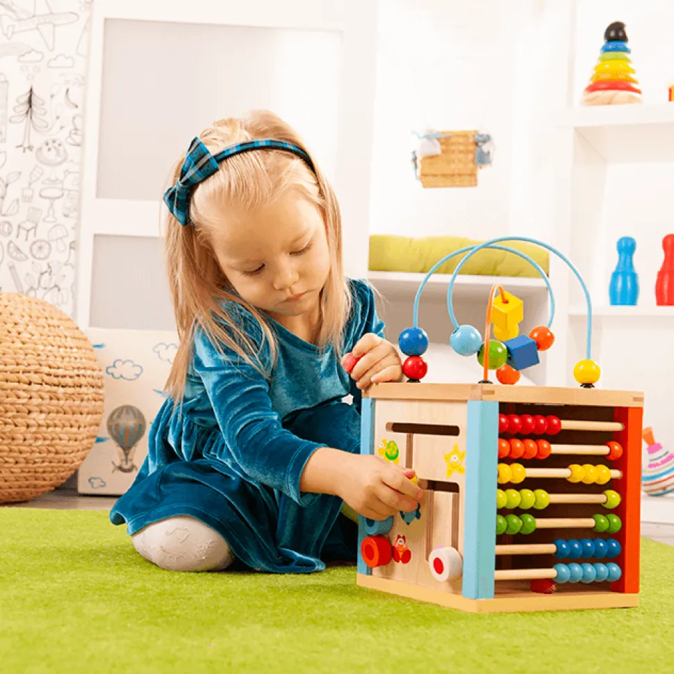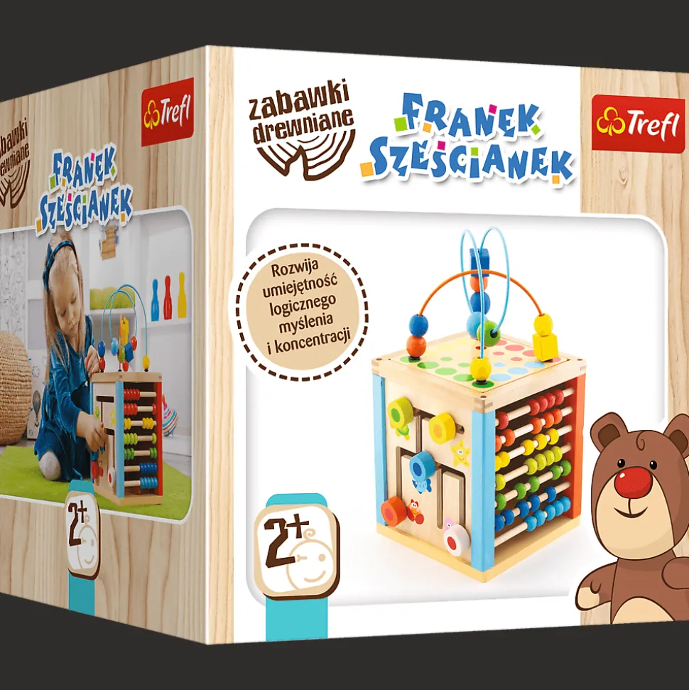 Kolorowy sześcian wykonany z jasnego, naturalnego drewna jest doskonałą zabawką ogólnorozwojową. Wielofunkcyjna kostka zawiera na każdej ściance inne zabawy, takie jak: lusterko, zegar, małe liczydło, zygzakowate pręciki do przesuwania kolorowych kuleczek, dzięki czemu stanowi mini plac zabaw dla każdej pociechy. Wszystkie materiały wykorzystane do stworzenia zabawki posiadają atesty, a także zostały pomalowane nietoksycznymi farbami.