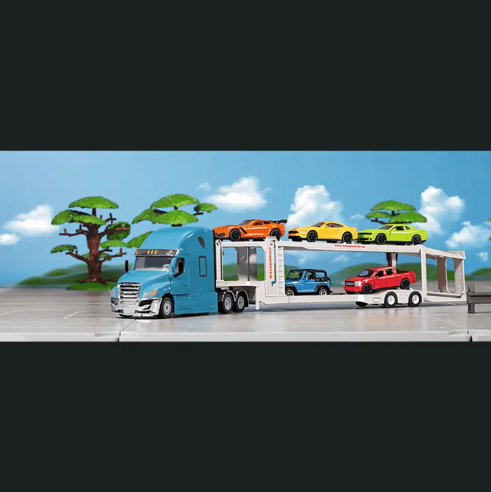 Freightliner Cascadia w modnym kolorze Miami Blue to wytrzymały i stabilny pojazd stworzony do najtrudniejszych misji. Pojazd posiada metalową karoserię, gumowe opony oraz otwieraną pokrywę silnika.