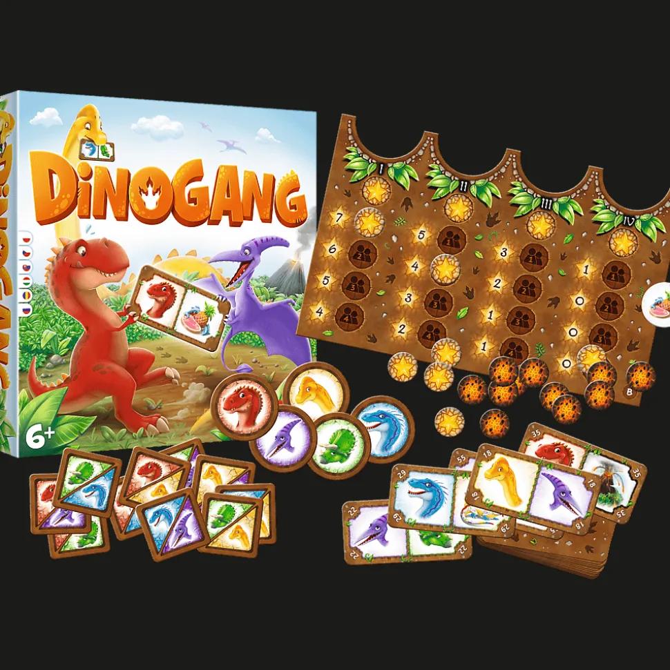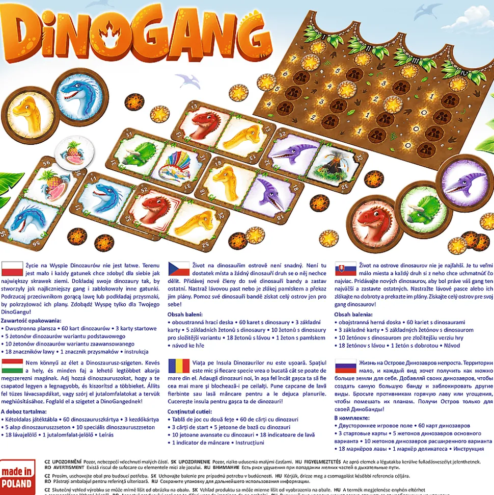 Życie na Wyspie Dinozaurów nie jest łatwe. Terenu jest mało i każdy gatunek chce zdobyć dla siebie jak największy skrawek ziemi. Dokładaj swoje dinozaury tak, by stworzyły jak najliczniejszy gang i zablokowały inne gatunki. Podrzucaj przeciwnikom gorącą lawę lub podkładaj przysmaki, by pokrzyżować ich plany. Zdobądź Wyspę tylko dla Twojego DinoGangu! Gra planszowa przeznaczona od 6 roku życia.