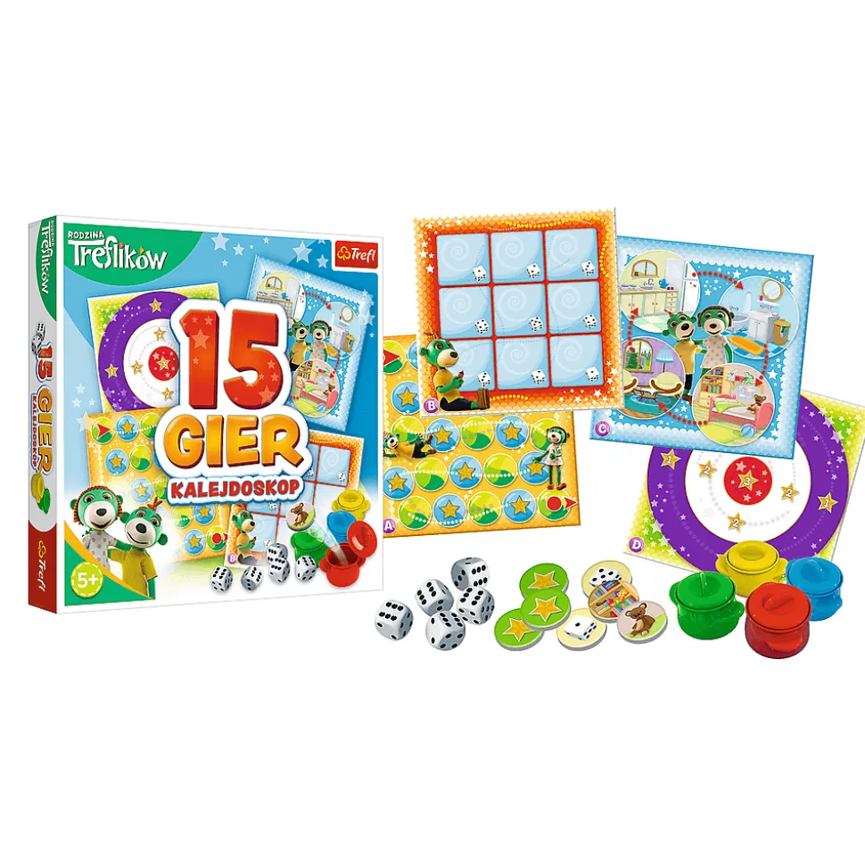 Kalejdoskop 15 gier to zestaw wciągających zabaw dla całej rodziny, wzbogacony oryginalnymi garnuszkami, pełniącymi funkcję pionków. Weźcie udział w wyścigu z przeszkodami, zbierajcie żetony, zbijajcie garnuszki pozostałych osób i sprawdźcie swoje siły podczas gry w kości. Bohaterowie serialu dla dzieci Rodzina Treflików czekają na Was!
