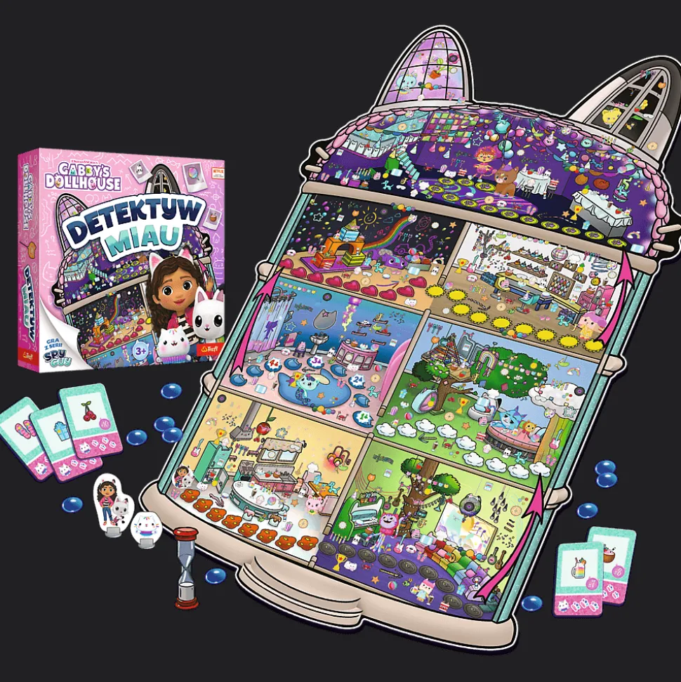 Tu liczy się spostrzegawczość i ścisła współpraca między graczami. Szukaj poszlak na dużej planszy w kształcie Kociego Domku Gabi i pomóż naszym bohaterom uratować Posypkowe Przyjęcie.