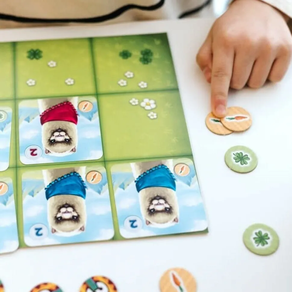 Witajcie na górskich pastwiskach zamieszkanych przez lamy i alpaki! W grze należy rozmieścić na swojej planszetce kolejne karty ze zwierzętami, tak aby obok siebie znalazły się 3 zwierzaki, które łączy wspólna cecha – rodzaj zwierzęcia, cyfra na karcie, lub kolor akcesoriów. Szukaj podobieństw! Im więcej wspólnych cech, tym więcej punktów, które przybliżą Cię do wygranej.