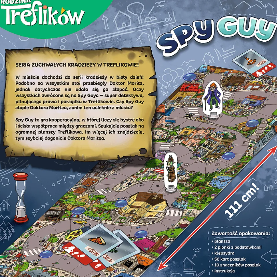 Spy Guy to gra kooperacyjna, w której liczy się spostrzegawczość i ścisła współpraca między graczami. Na ponad metrowej planszy Treflikowa poszukajcie wskazówek, które przybliżą Was do ujęcia sprawcy.