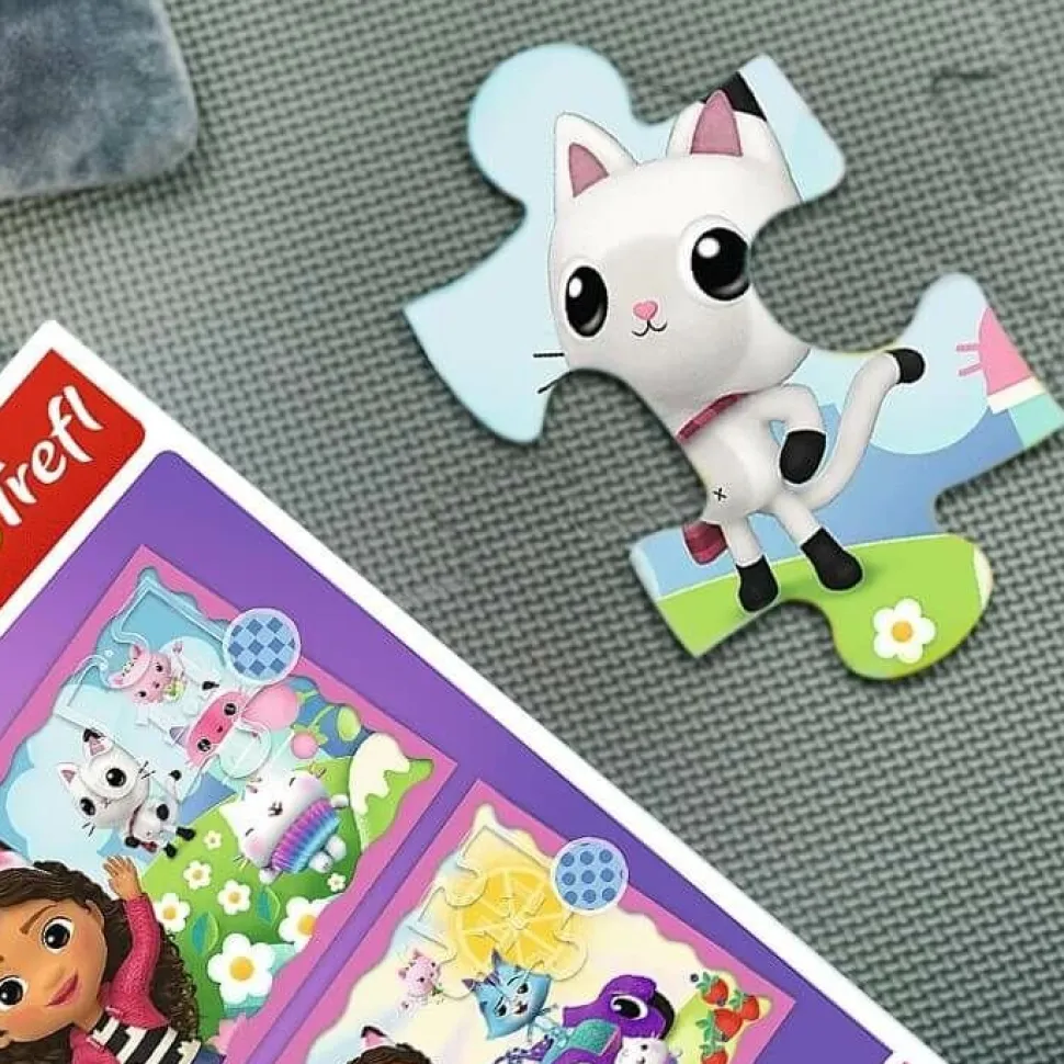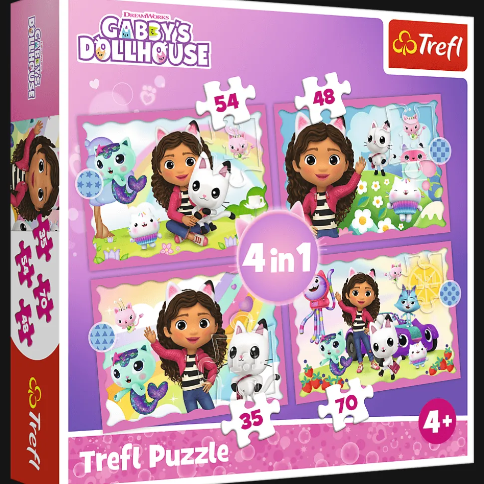 Przygody Gabi 4 w 1 to zestaw czterech układanek dla dzieci od Trefl. Puzzle te przedstawiają przygody Gabi z popularnej bajki „Koci Domek Gabi”. Każda z czterech układanek ma różną ilość elementów (35, 48, 54 i 70 elementów), co pozwala na stopniowe wprowadzanie dziecka w świat układania puzzli.