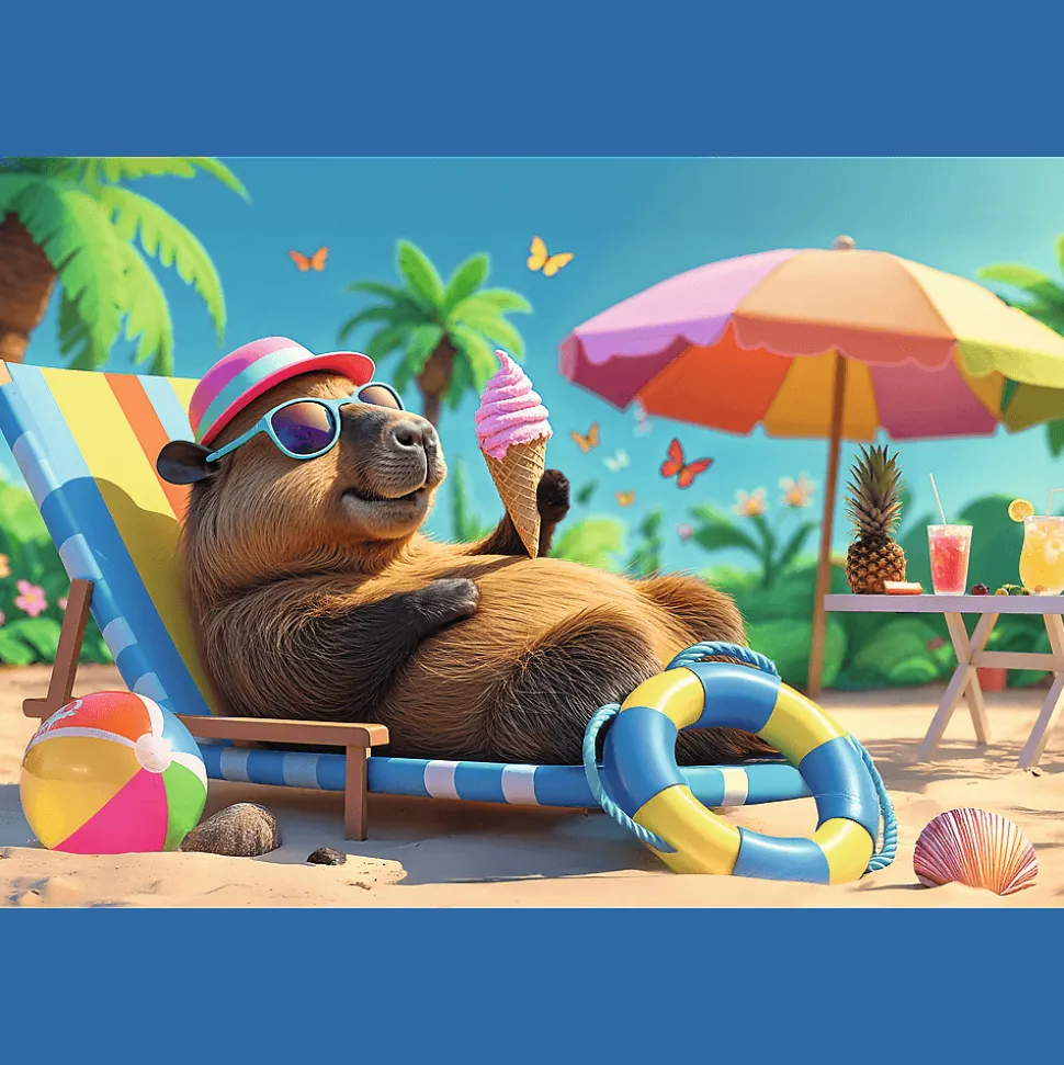 Relaks w stylu kapibary to puzzle składające się ze 100 elementów, zaprojektowane z myślą o małych fanach zwierząt. Po ułożeniu układanki powstanie obrazek o wymiarach 410×275 mm, przedstawiający zrelaksowaną kapibarę na plaży.