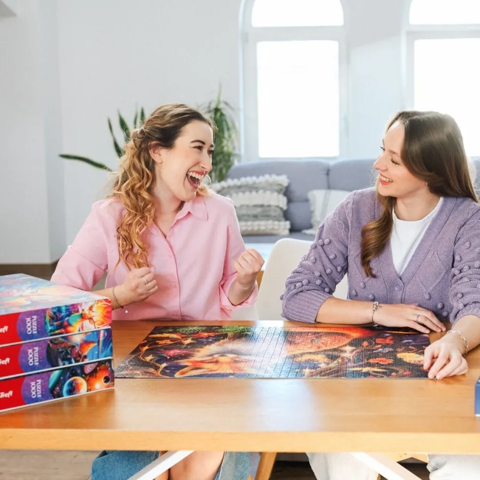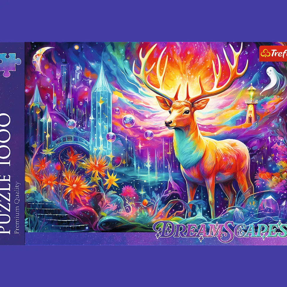 Puzzle DreamScapes: Mistyczny jeleń, składające się z 1000 elementów, przedstawiają majestatycznego jelenia na tle barwnej scenerii pełnej kwiatów i nierzeczywistych kształtów. Po ich ułożeniu powstanie obrazek w rozmiarach 683×480 mm.