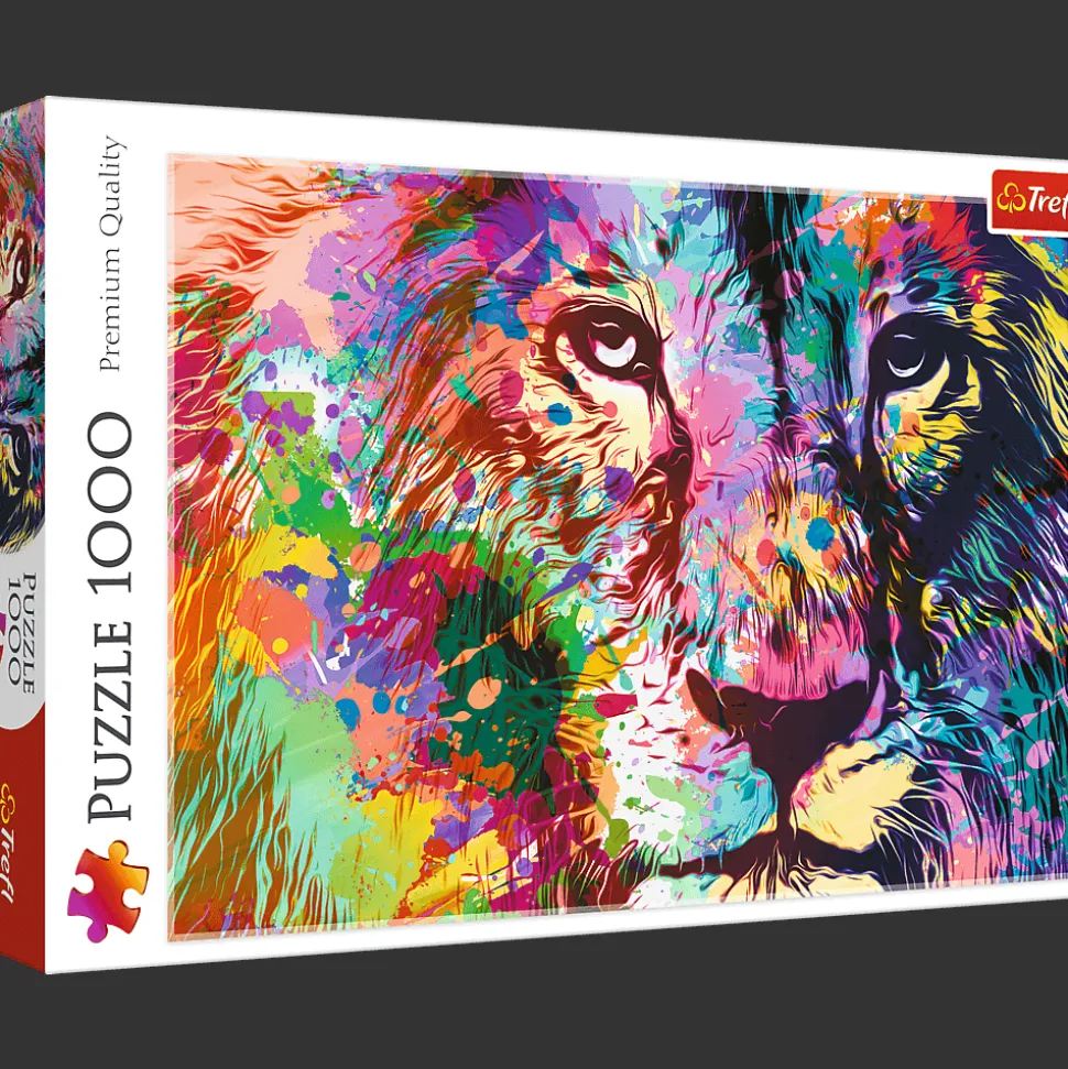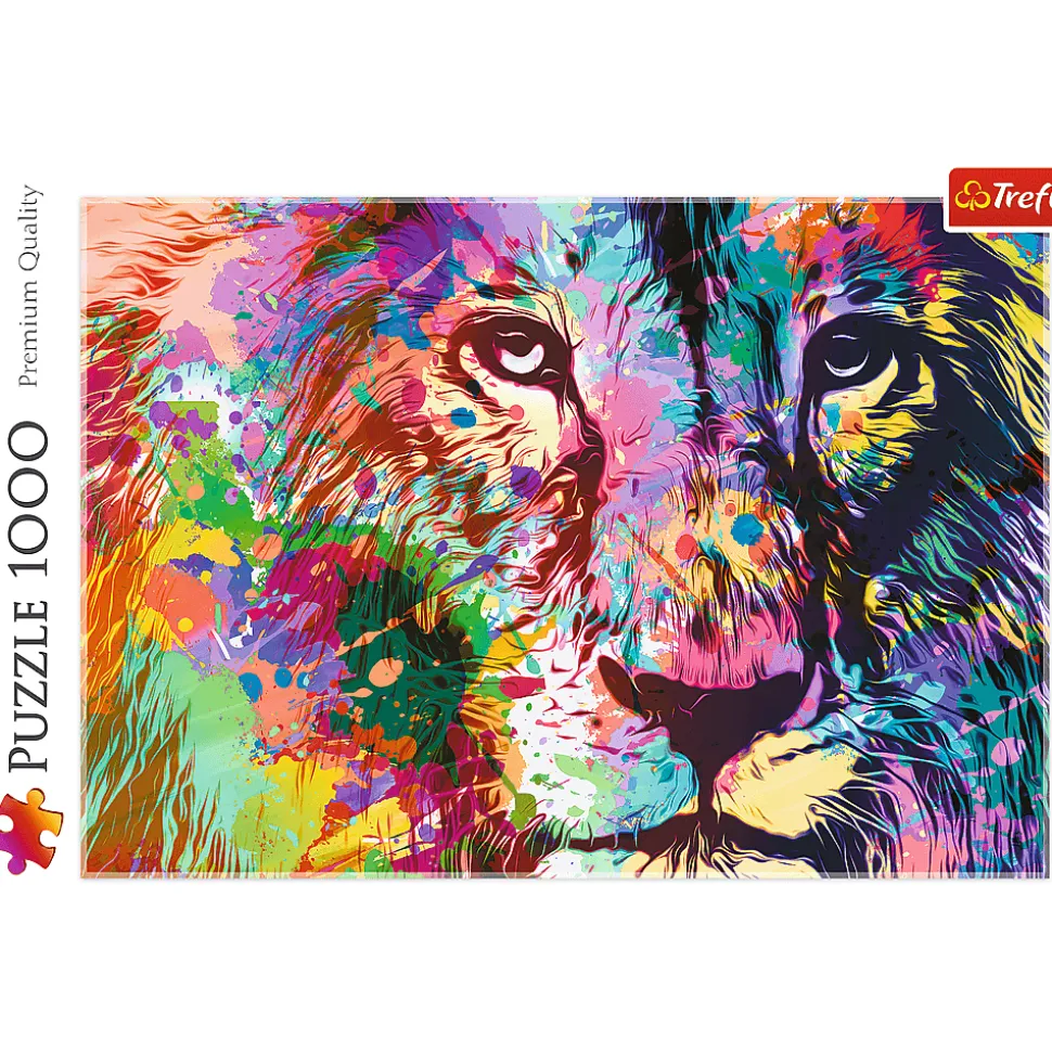 Puzzle składające się z 1000 elementów przedstawiają kolorową głowę lwa. Po ułożeniu powstanie obrazek o wymiarach 683×480 mm.