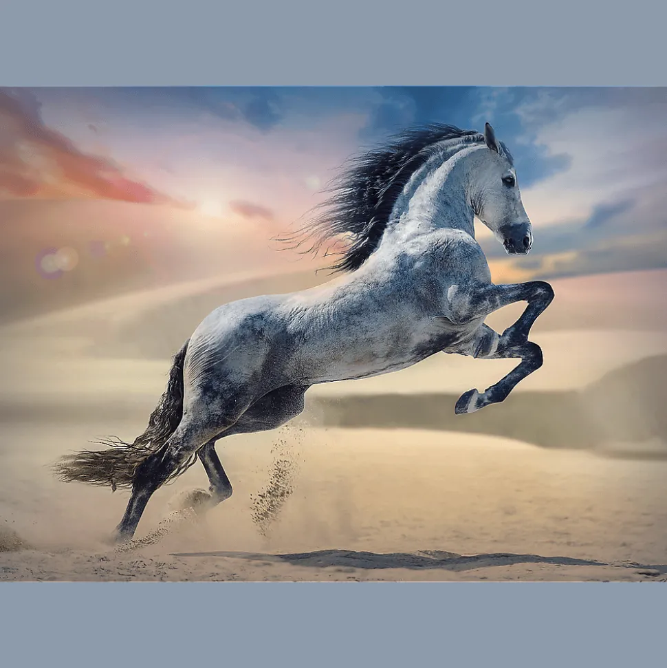 Puzzle Majestatyczny koń, składające się z 1000 elementów, przedstawiają biegnące po pustyni zwierzę, na tle zachodzącego słońca. Po ich ułożeniu powstanie obrazek o wymiarach 683×480 mm.