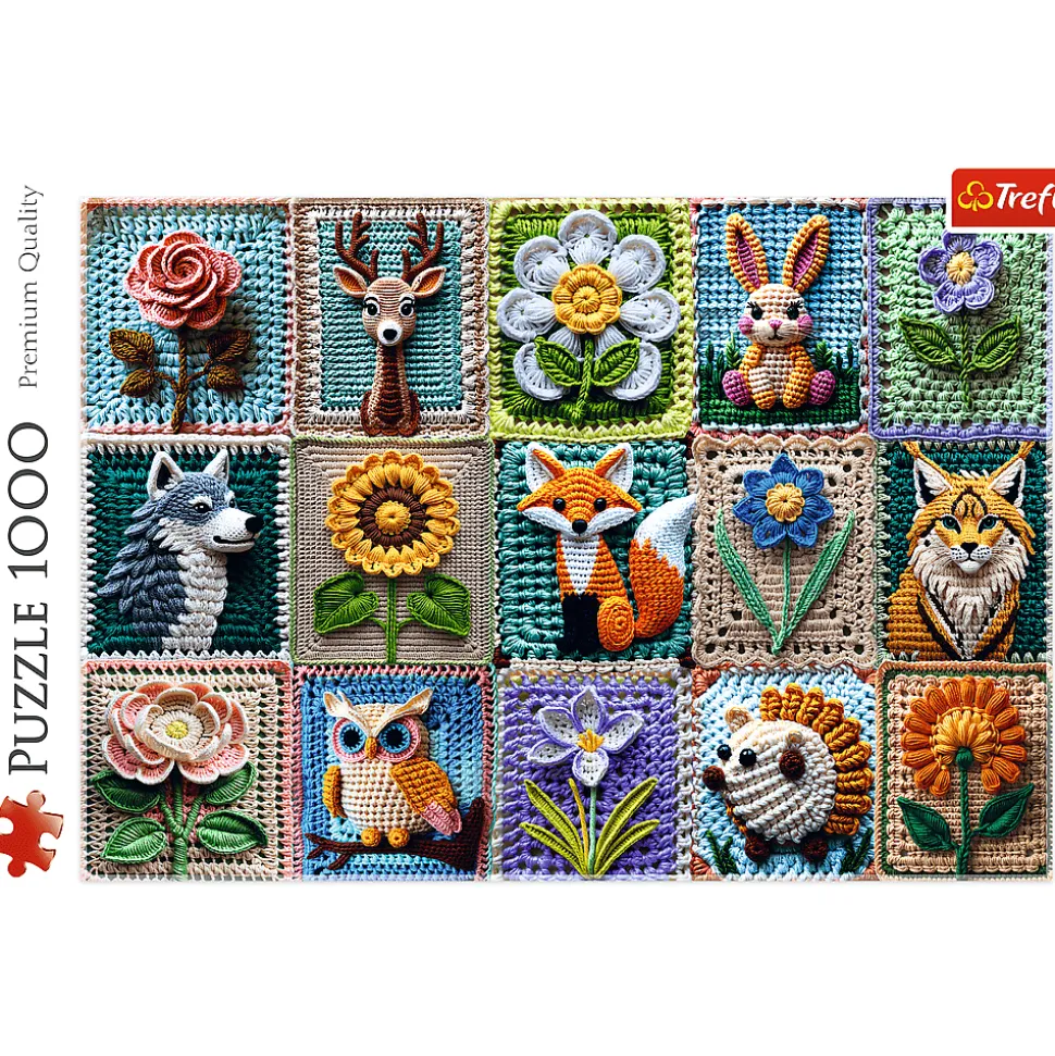 Puzzle Szydełkowanie – moja pasja, składające się z 1000 elementów, przedstawiają kolaż ze zwierzętami i kwiatami zrobionych metodą szydełkową. Po ich ułożeniu powstanie obrazek w rozmiarach 683×480 mm.