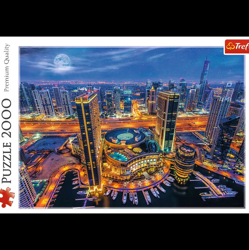 Puzzle 2000 elementów ze wspaniałym widokiem na rozświetlony Dubaj po zmroku. Po ułożeniu powstanie obrazek o wymiarach 96×68 cm. Wysoką jakość, nasycenie kolorów i bezpieczeństwo układania zapewnia kalandrowany papier odbijający światło, pokryty ekologicznymi farbami spożywczymi.