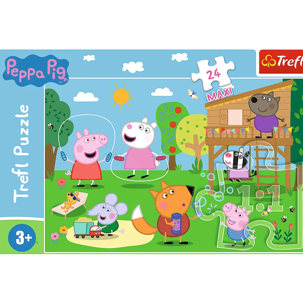 Zabawy na polanie to puzzle składające się z 24 MAXI elementów, zaprojektowane z myślą o fanach animowanej bajki Świnka Peppa. Po ułożeniu powstanie obrazek o wymiarach 600×400 mm.