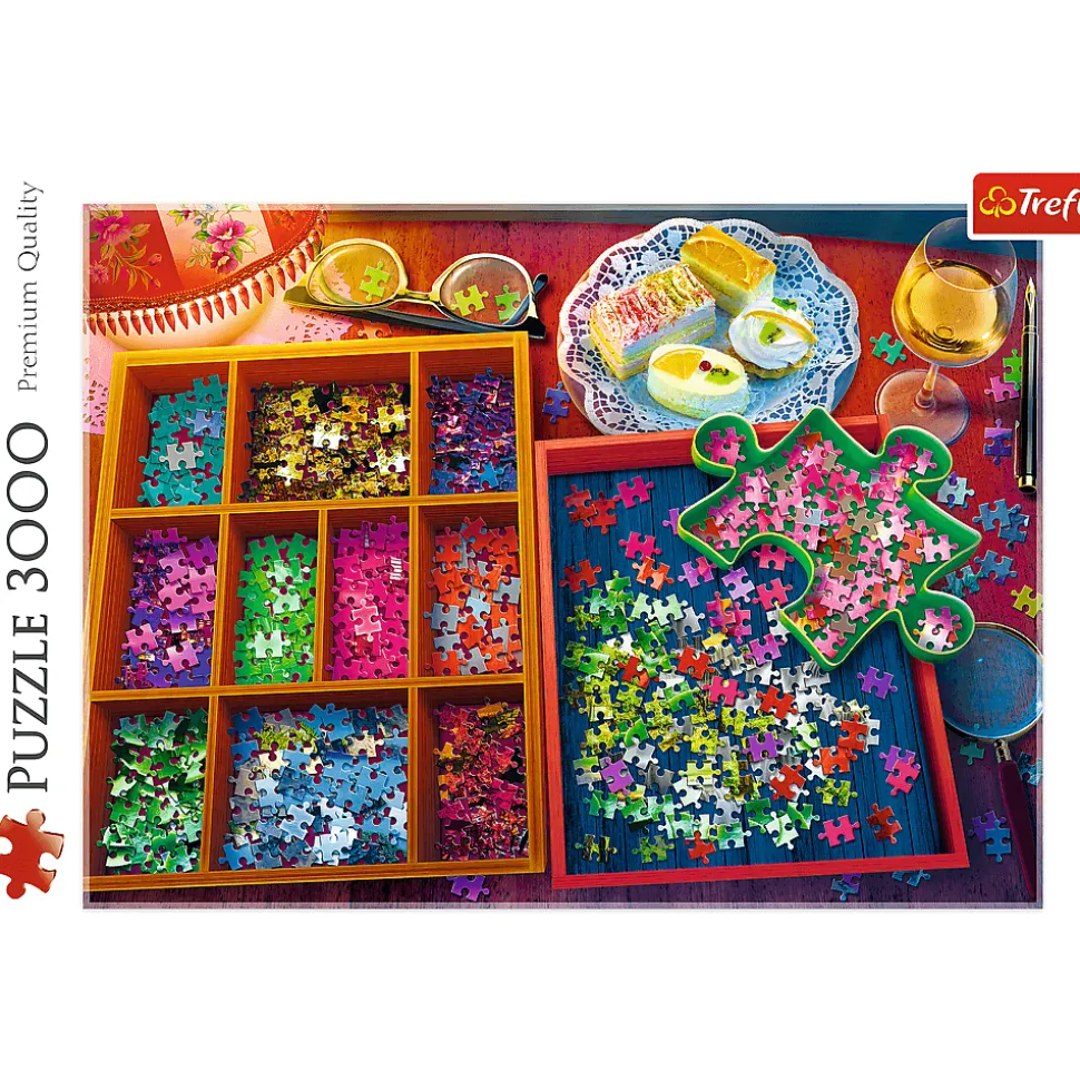 Puzzle Wieczór z puzzlami składające się z 3000 elementów przedstawiają rozsypane puzzle na stole. Po ułożeniu powstanie plakat o wymiarach 116x85cm. Wysoką jakość, nasycenie kolorów i bezpieczeństwo układania zapewnia kalandrowany papier odbijający światło, pokryty ekologicznymi farbami spożywczymi.