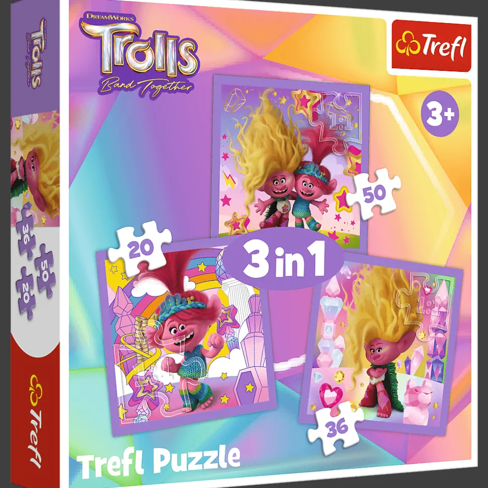 Poznaj wesołe Trolle to puzzle dla dzieci składające się z 3 niezależnych układanek, zaprojektowane z myślą o wszystkich fanach i fankach przygód bohaterów bajki Trolls. Po ułożeniu układanek powstaną obrazki o wymiarach 200×195 mm. Zróżnicowana liczba elementów pozwala na zabawę zarówno młodszym, jak i nieco starszym dzieciom.