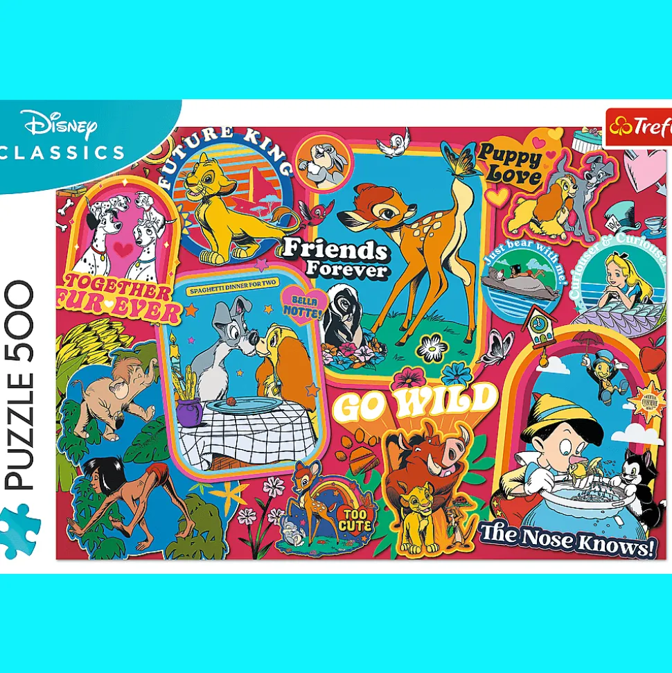 Disney: Na przestrzeni lat to puzzle 500 elementów przedstawiające widok na ujęcia z kultowych produkcji Disney’a.