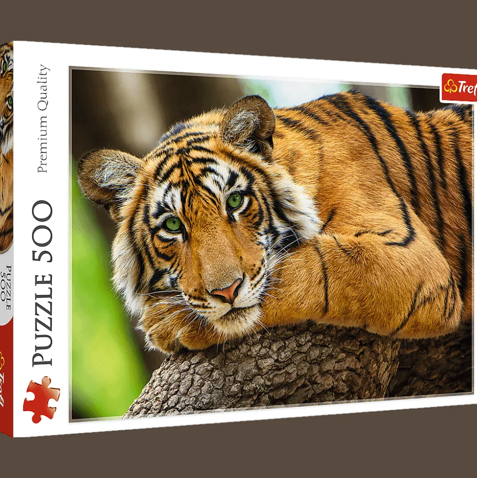 Puzzle 500 elementów przedstawiające fascynujący portret tygrysa. Po ułożeniu powstanie obrazek o wymiarach 48×34 cm. Wysoką jakość, nasycenie kolorów i bezpieczeństwo układania zapewnia kalandrowany papier odbijający światło, pokryty ekologicznymi farbami spożywczymi.