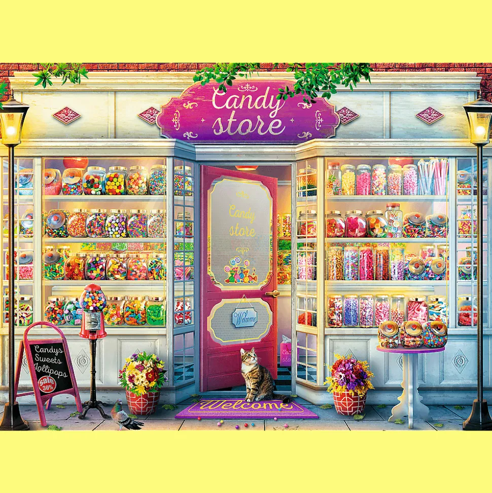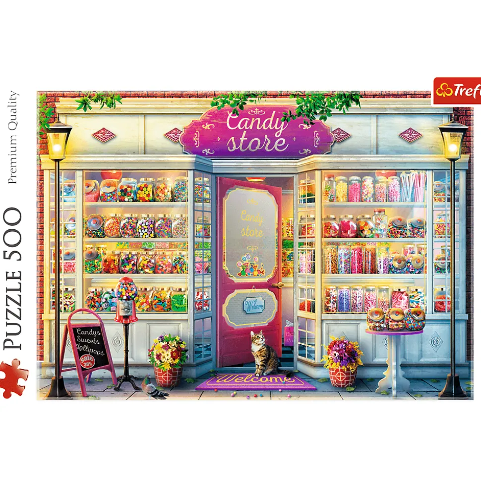Puzzle składające się z 500 elementów przedstawiające sklepik ze smakowitymi słodyczami. Po ułożeniu powstanie obrazek o wymiarach 480 x 340 mm.