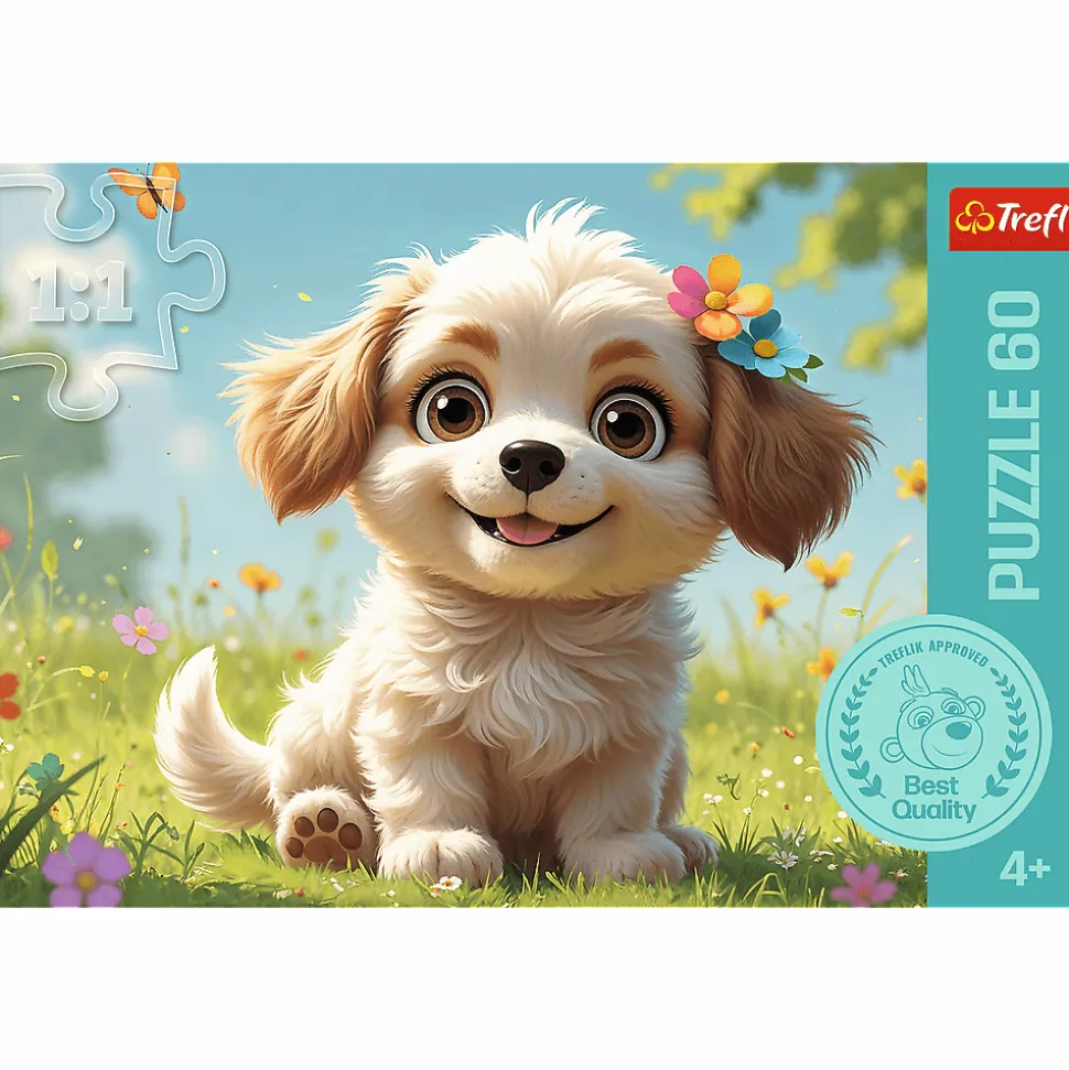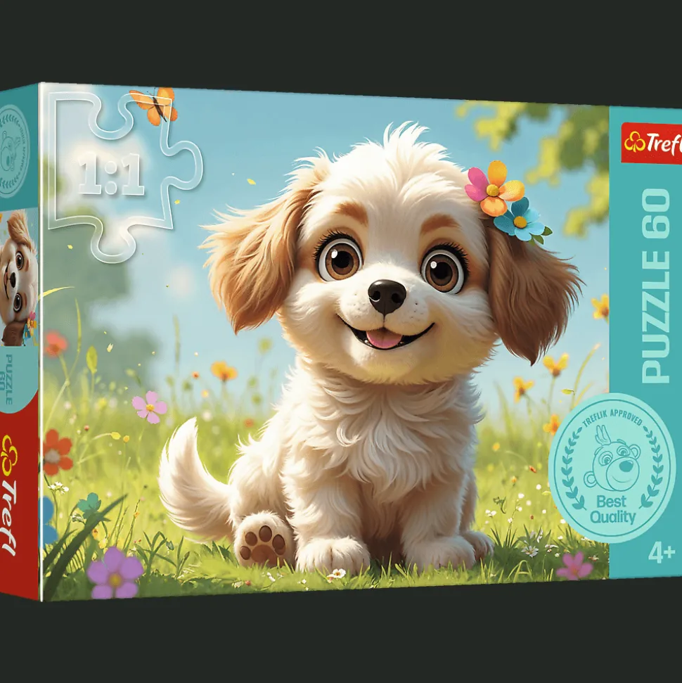 Szczeniaczkiem być! to puzzle składające się z 60 elementów, zaprojektowane z myślą o małych fanach zwierząt. Puzzle przedstawiają uśmiechniętego szczeniaczka na łące. Po ułożeniu układanki powstanie obrazek o wymiarach 330×220 mm.