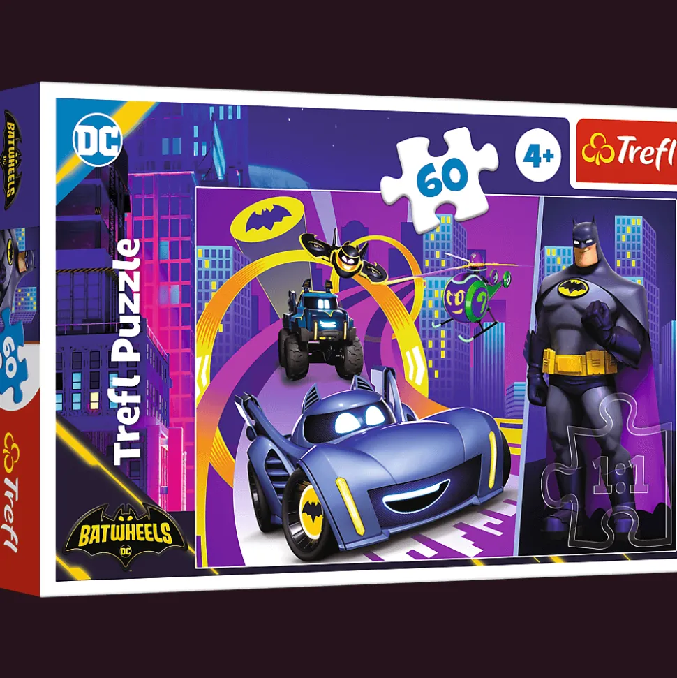 Batman i jego pojazdy to puzzle składające się z 60 elementów, zaprojektowane z myślą o małych fanach serialu o pojazdach z uniwersum DC. Po ułożeniu układanki powstanie obrazek o wymiarach 330×220 mm.
