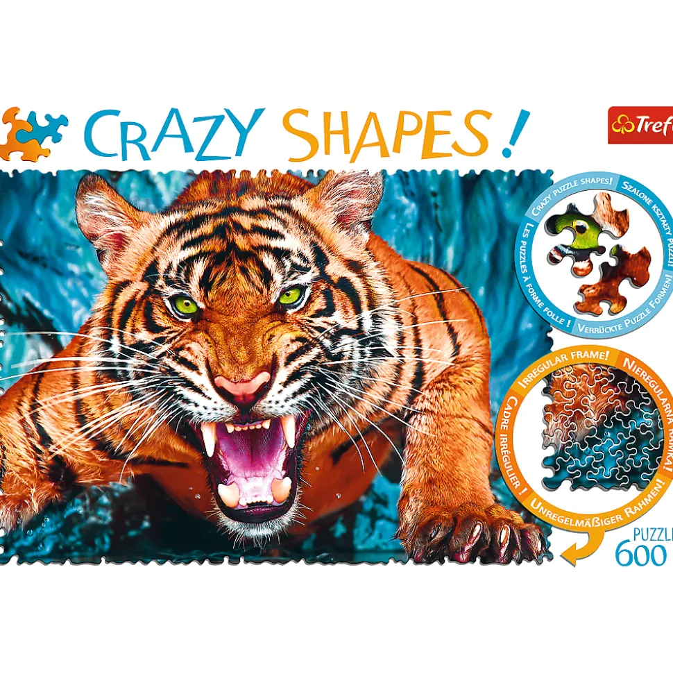 Crazy Shapes! to najbardziej szalona seria puzzli na świecie, w której: puzzle mają zwariowany, niestandardowy kształt, nie ma żadnych prostych linii, krawędź obrazu jest zakręcona i nieregularna. Puzzle składają się z 600 elementów, po ułożeniu powstanie obrazek o wymiarach 680 x 480mm przedstawiający tygrysa. Produkt został wykonany z wysokiej jakości materiałów, z zastosowaniem specjalnego kalandrowanego papieru odbijającego światło, co ułatwia układanie.