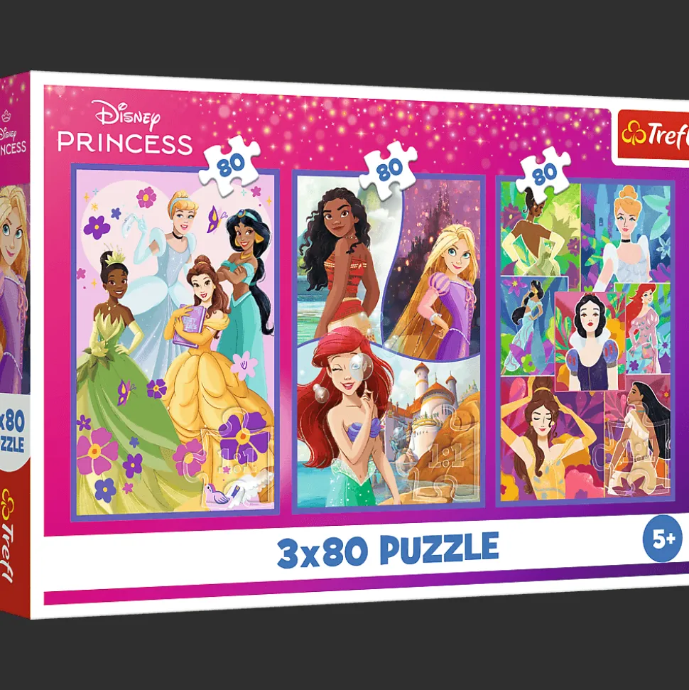 Księżniczki przyjaciółki to puzzle przedstawiające księżniczki Disneya w trzech, zupełnie różnych, odsłonach. Każda z układanek pozwoli stworzyć obrazek o wymiarach 275×180 mm.