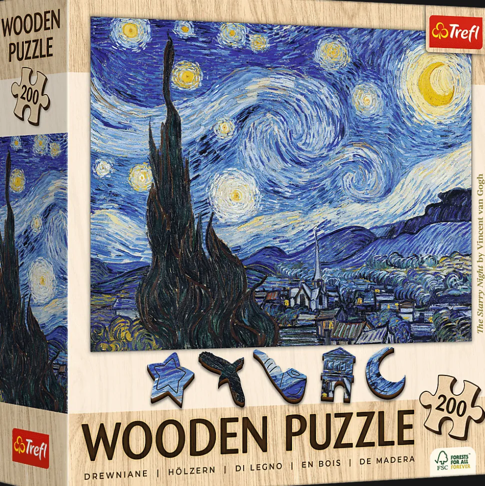 WOODEN PUZZLE 200 elementów przedstawiające znany na całym świecie obraz Gwiaździsta Noc, Vincent van Gogh.