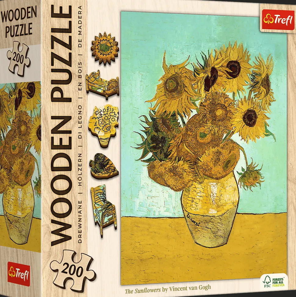 WOODEN PUZZLE 200 elementów przedstawiające znany na całym świecie obraz Słoneczniki – Vincent van Gogh.