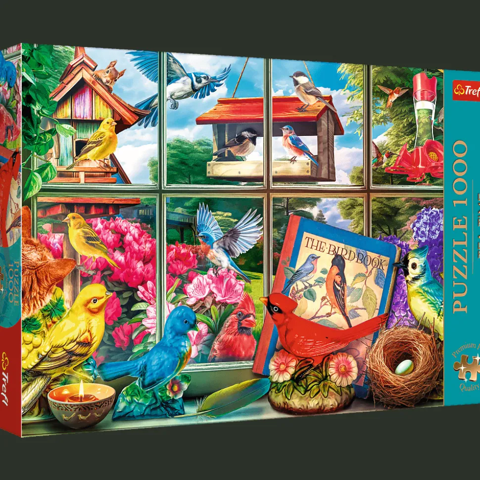Puzzle Świat ptaków przedstawiają kolorowe ptaki i ich domki, ukazane z ciekawej perspektywy. Po ich ułożeniu powstanie obraz o wymiarach 683×480 mm.