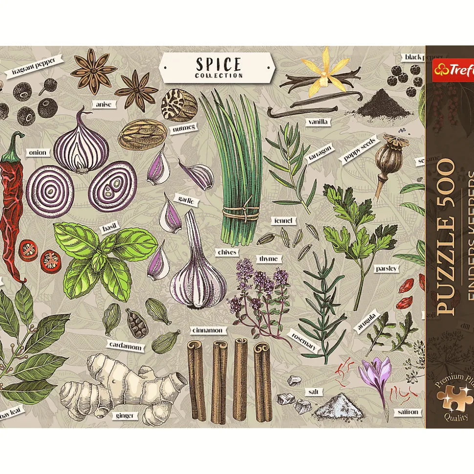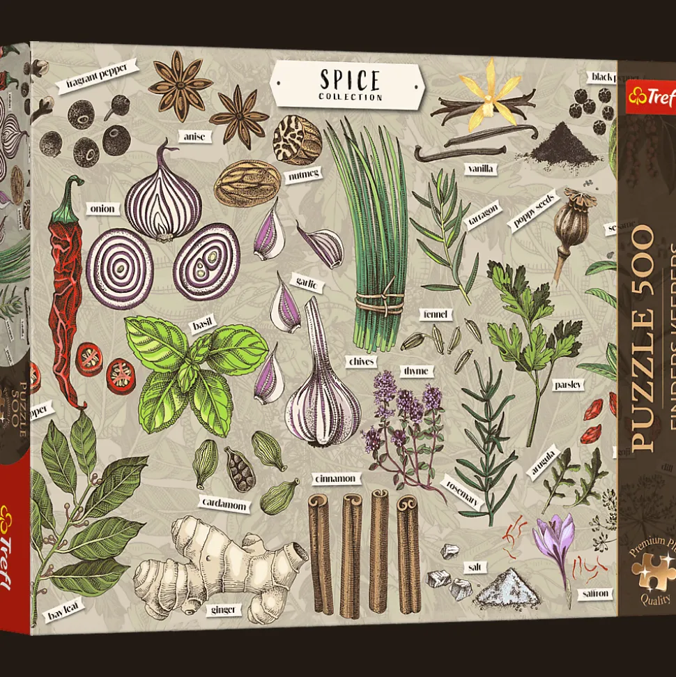 Puzzle Finders Keepers: Przyprawy przedstawiają zilustrowaną kolekcję przypraw, ziół i warzyw, która wygląda jak kulinarna mapa skarbów dla każdego miłośnika gotowania. Po ich ułożeniu powstanie obraz o wymiarach 480×340 mm.
