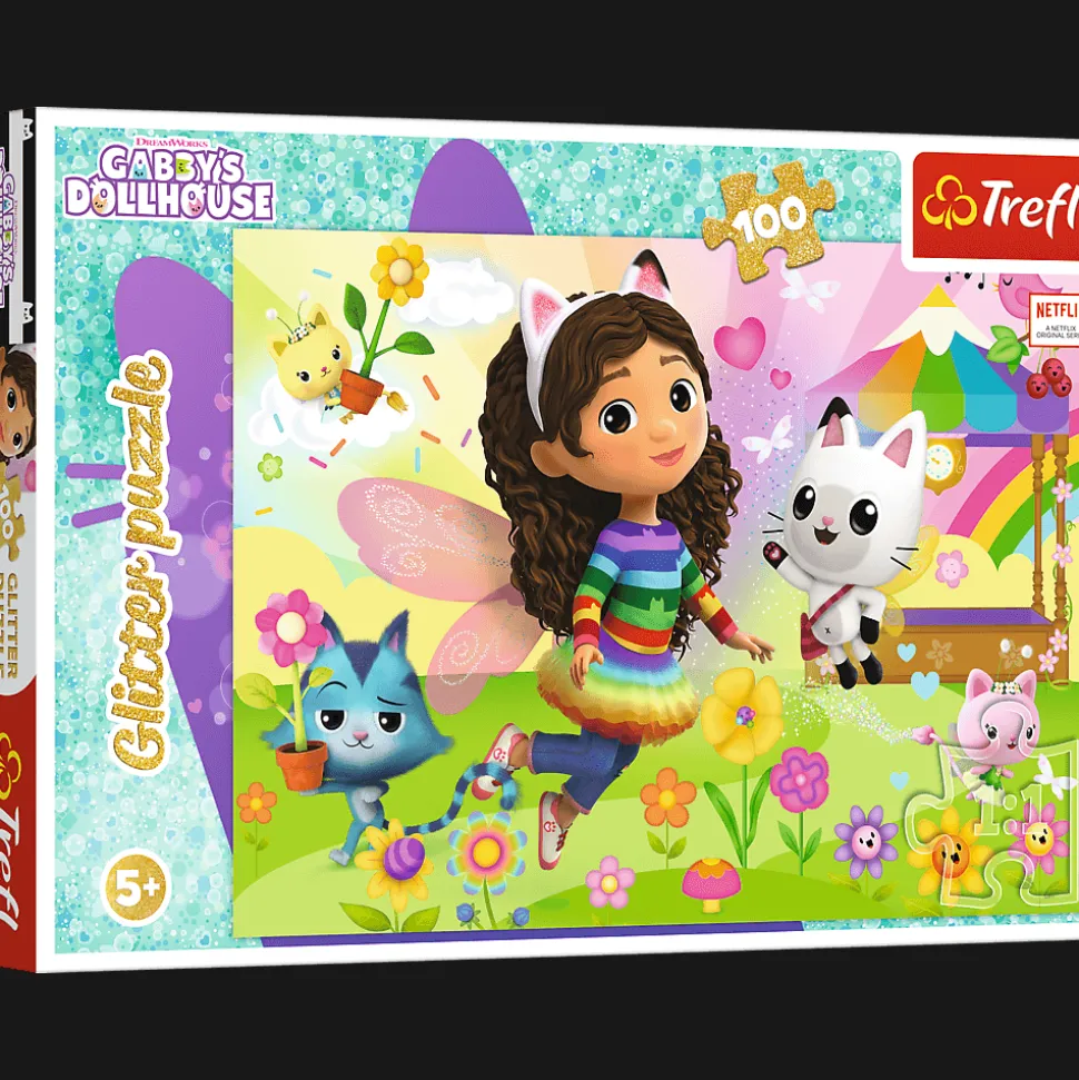 Brokatowa Gabby to puzzle z serii Glitter, składające się ze 100 elementów. Układanka została pokryta delikatnym, złotym brokatem, który sprawia, że zarówno opakowanie, jak i poszczególne elementy pięknie się mienią! Po ułożeniu puzzli powstanie obrazek o wymiarach 410×278 mm, który zachwyci wszystkich małych fanów bajki Koci Domek Gabi.
