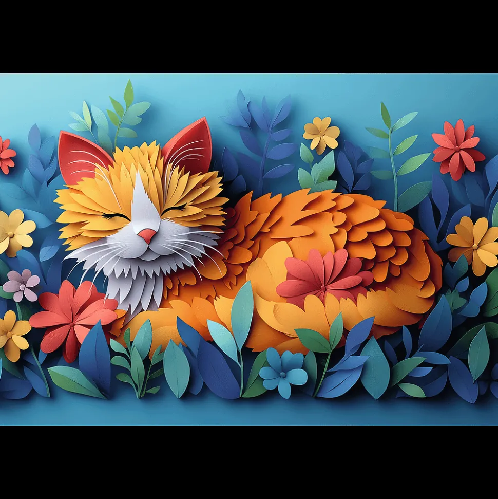 Obrazek inspirowany sztuką paper art po ułożeniu ma wymiary 410×275 mm i przedstawia kota.