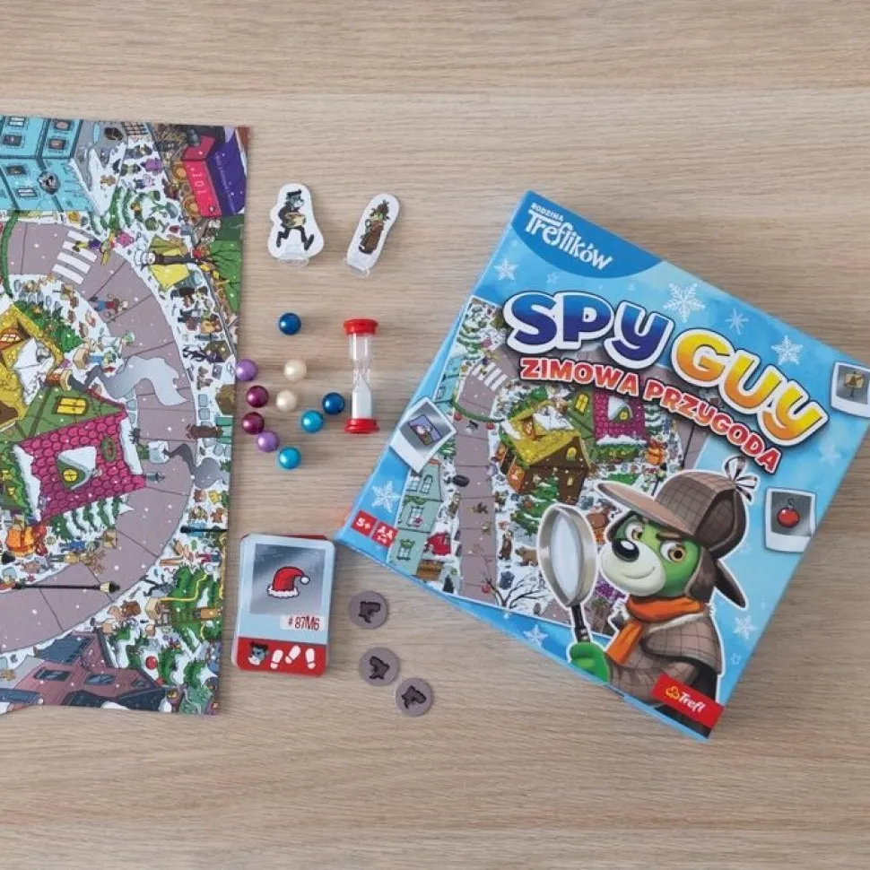Spy Guy: Zimowa Przygoda to nowa wersja gry Spy Guy. Plansza i karty poszlak przygotowane są w świątecznym klimacie, a znalezione przedmioty zaznaczacie kolorowymi bombkami.