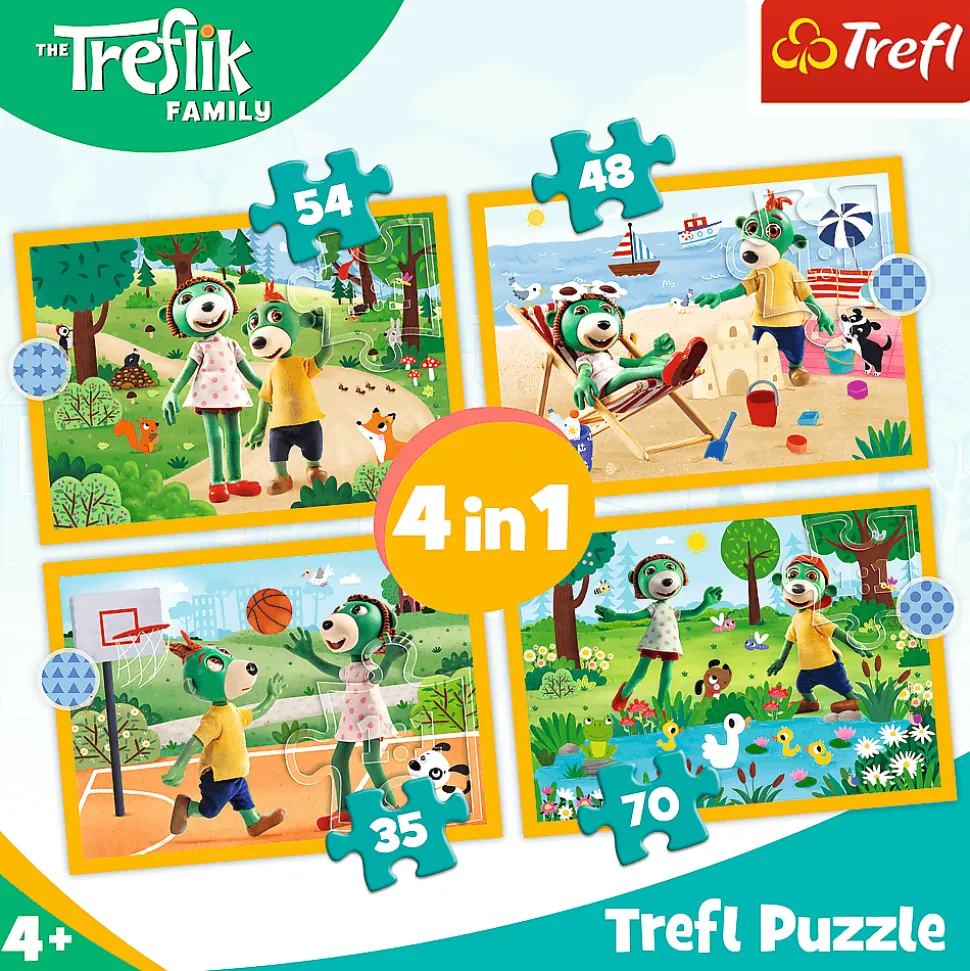 Trefliki na wakacjach to puzzle dla dzieci składające się z 4 niezależnych układanek, zaprojektowane z myślą o wszystkich fanach i fankach bohaterów bajki Rodzina Treflików. Po ułożeniu puzzli powstaną cztery obrazki o wymiarach 285 x 205 mm każdy. Zróżnicowana liczba elementów (35, 48, 54, 70) pozwala na zabawę zarówno młodszym, jak i nieco starszym fanom puzzli.
