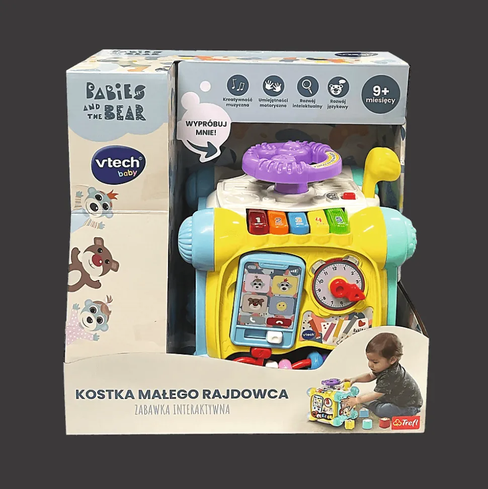 Kostka Małego Rajdowca to wesoła zabawa na każdej 6 kolorowych ścianek. Użyj jednego z dwóch trybów zabawy: Odkrywanie lub muzyka. Naciskaj, obracaj, przesuwaj i kręć ruchomymi elementami, aby nauczyć się cyfr, nazw kolorów i świateł drogowych. Sorter kształtów, zegar, klawisze pianina, wyjmowany telefon komórkowy i koła zębate pobudzą zdolności motoryczne i pozwolą ćwiczyć koordynację wzrokowo-ruchową.