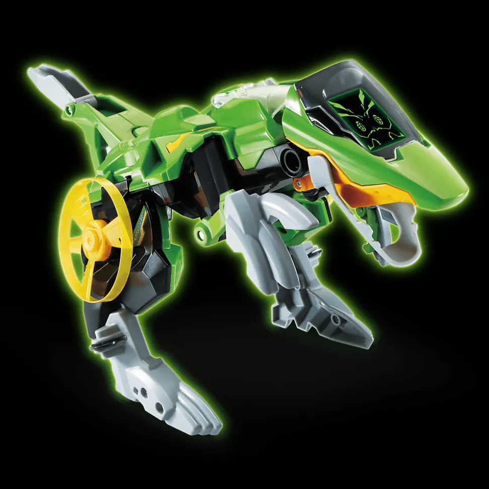 Pulsor to terizinozaur, który zamienia się w samolot myśliwski! Przekształć dinozaura w pojazd lub na odwrót i zobacz jak zmieniają się animacje na ekranie LCD. Specjalne przyciski aktywują dźwięki, wypowiedzi i ruchome elementy, dzięki czemu zabawa jest jeszcze ciekawsza!