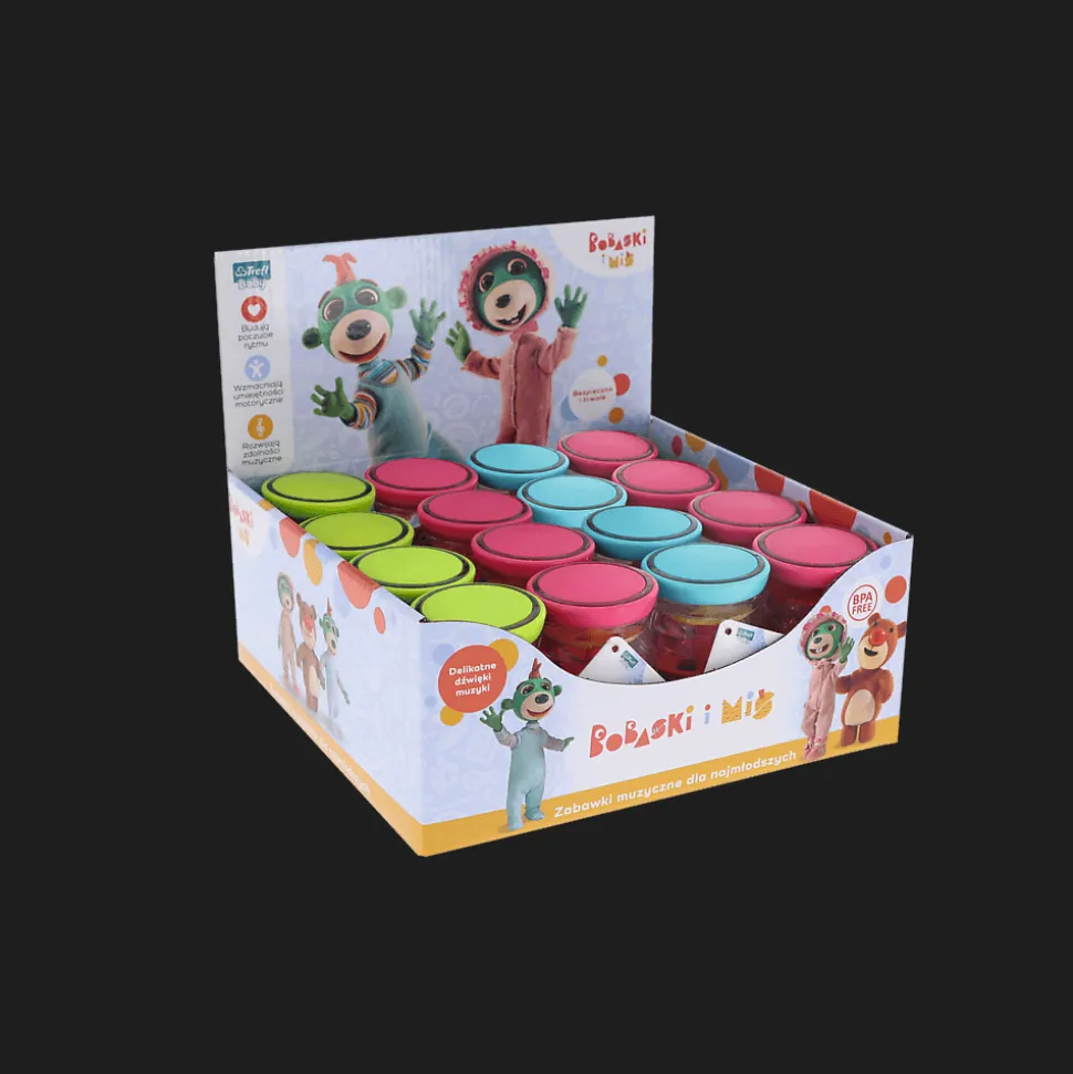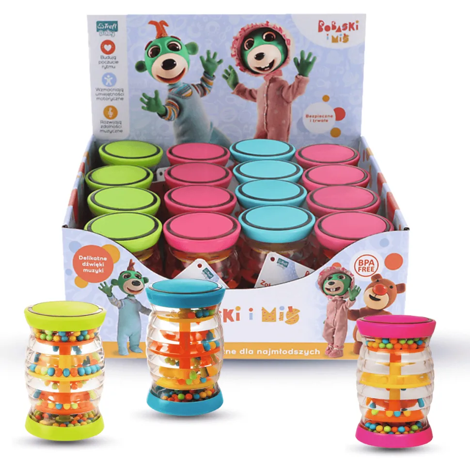Kupując produkt, kupujesz 16 sztuk zabawki w displayu (grzechotka posiada 3 wersje kolorystyczne — w opakowaniu znajdziesz po 5 szt. każdej z nich + 1 dobraną losowo).