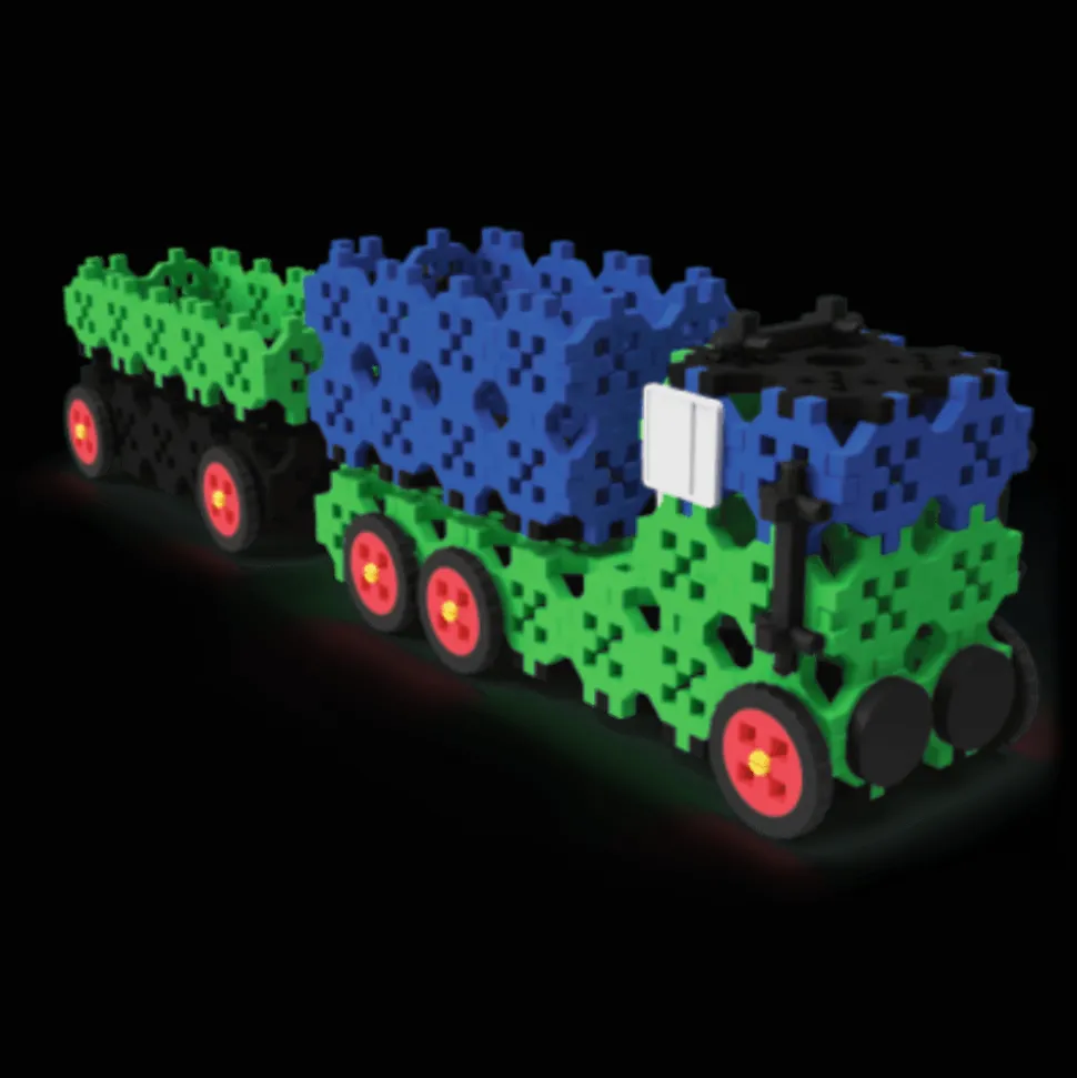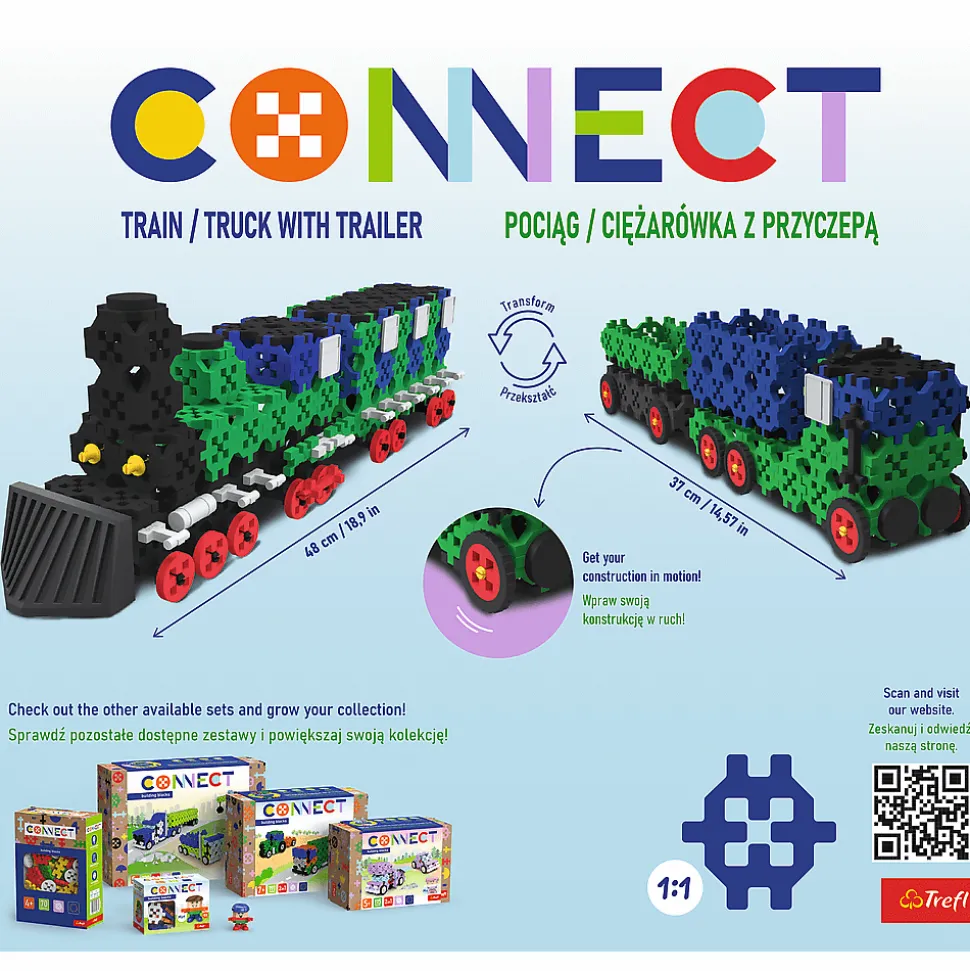 Zestaw konstrukcyjny 2w1: Train / Truck with Trailer pozwala zbudować dwie różne konstrukcje: pociąg lub ciężarówkę z przyczepą. W zestawie znajdziesz 279 klocków, w tym dedykowaną figurkę o imieniu Rob, ruchome części i ozdoby – zbuduj z nich mobilne konstrukcje zgodnie z dołączoną instrukcją lub puść wodzę fantazji i daj upust kreatywności, realizując swoje pomysły.
