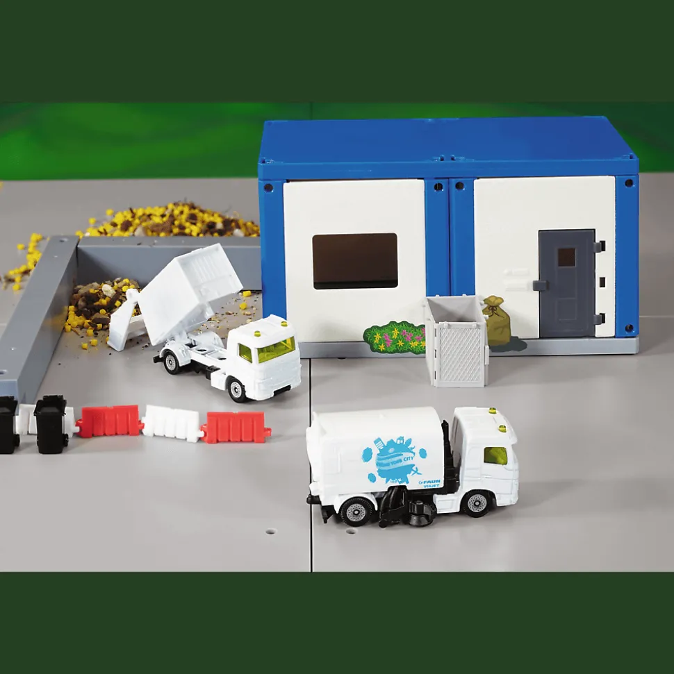Nasze miasto musi być czyste i uporządkowane. O to dba zestaw Siku, składający się z zamiatarki i śmieciarki Faun Umwelttechnik. Ten idealnie wyposażony do wszystkich zadań bezkonkurencyjny duet oczyszcza ulice oraz place z brudu i śmieci. Oba pojazdy mają białe metalowe kabiny i dwuosiowe plastikowe podwozia z sprawnie obracającymi się kołami. Zamiatarka posiada nadwozie i ssawę, a skrzynię ładunkową śmieciarki można przechylać i otwierać tylną klapę.
