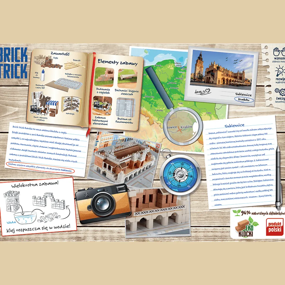 Krakowskie Sukiennice na wyciągnięcie ręki? Dlaczego nie! Sukiennice to kolejna konstrukcja z serii Brick Trick, której replikę zbudujesz z prawdziwych cegieł i dodatkowych elementów ozdobnych. m.in. 5 metrów drewnianych deseczek i tekturowego dachu, które gwarantują jeszcze więcej zabawy. Murowanie przy użyciu prawie pół tysiąca białych i czerwonych cegieł z typowymi dla tego budynku nadprożami łukowymi jeszcze nigdy nie było tak pasjonujące. Zbudowana replika Sukiennic ma ponad 30cm długości i z pewnością będzie dumą każdego młodego budowniczego!