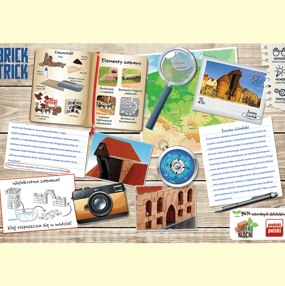 Myślisz Gdańsk – mówisz Żuraw! To jedna z najpopularniejszych i najpiękniejszych zarazem atrakcji nadmorskiego miasta. Seria Brick Trick Podróże umożliwia Ci skonstruowanie tej charakterystycznej budowli w wersji „mini”. 370 prawdziwych, czerwonych cegieł, ponad 6,5 metra drewnianych deseczek oraz pigment barwiący pozwolą na odwzorowanie historycznego dźwigu portowego. Dodatkowe elementy z tektury, z których wykonasz bramę i dach, jak również pieczołowicie przygotowana naklejka z rozrysem fundamentu pozwolą Ci poczuć średniowieczny klimat Żurawia i całego Gdańska. Zestaw zawiera aż 96% naturalnych składników!