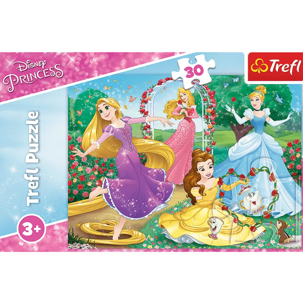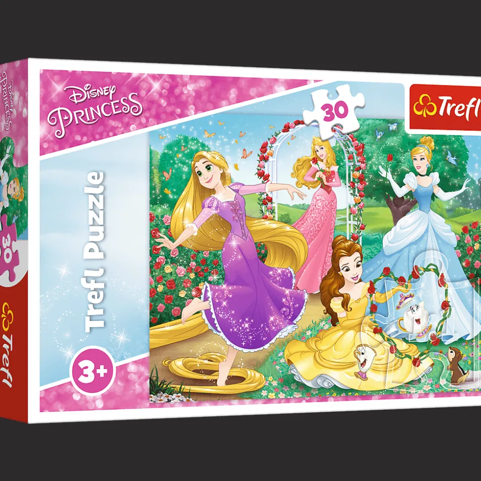 Puzzle 30 elementów z księżniczkami Disney. Po ułożeniu powstanie obrazek o wymiarach 27×20 cm. Wysoką jakość, nasycenie kolorów i bezpieczeństwo układania zapewnia kalandrowany papier odbijający światło, pokryty ekologicznymi farbami spożywczymi.