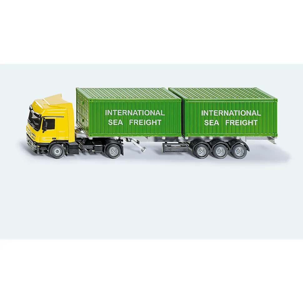 Ciężarówka z naczepą, która przetransportuje morskie kontenery. Naczepie można zmienić długość w zależności od ładunku, a kontenery posiadają otwierane drzwi.