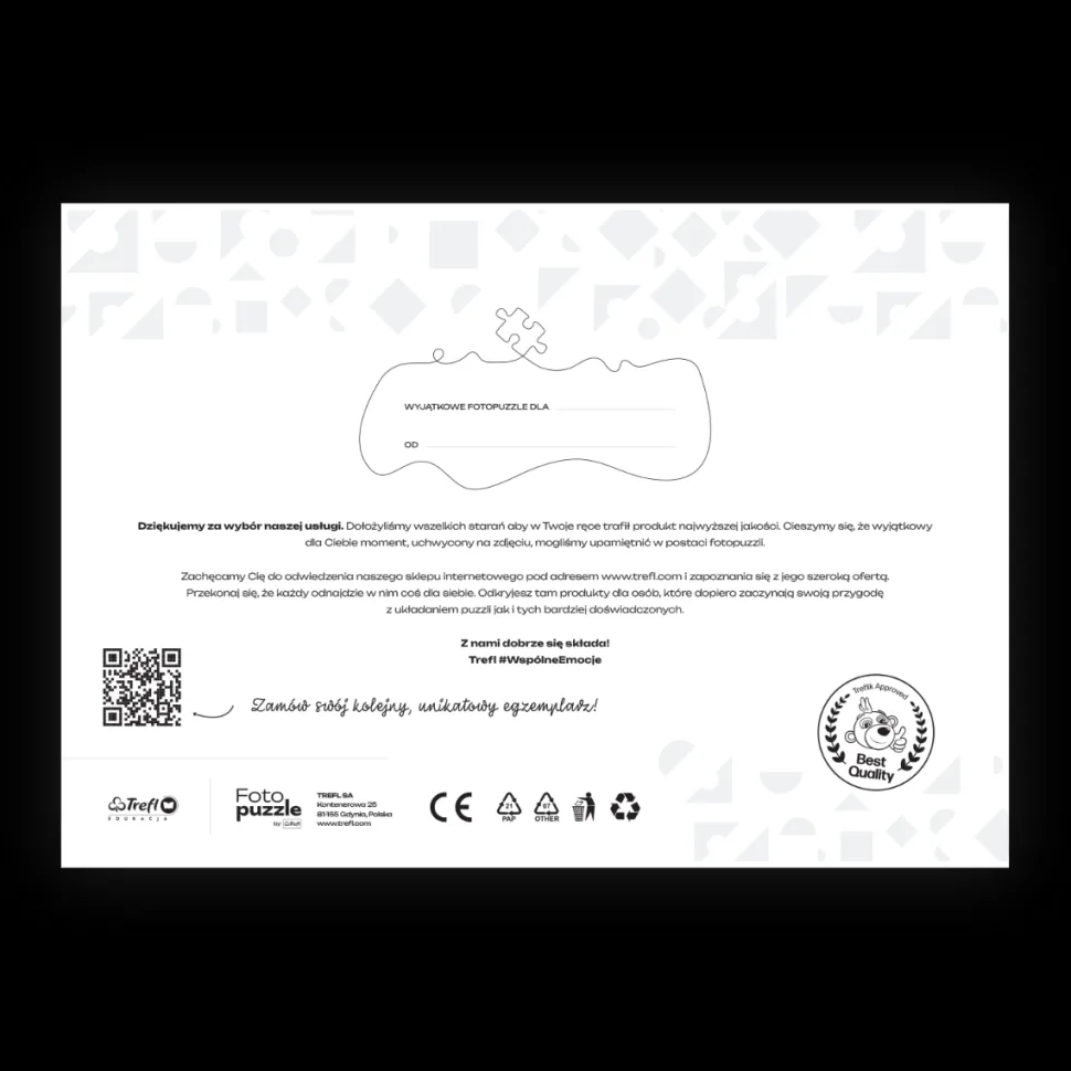 Podaruj radosne wspomnienia, wybierając fotopuzzle ramkowe marki Trefl! Stwórz własny kolaż z ulubionych zdjęć, za pomocą naszego intuicyjnego edytora, który pozwala na łatwą obróbkę, w tym nakładanie filtrów, obracanie i przycinanie zdjęć, a także dodawanie stickerów i tekstu.
