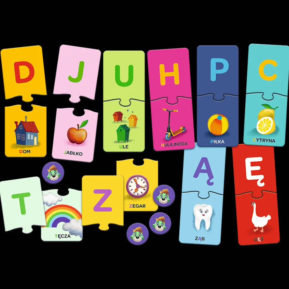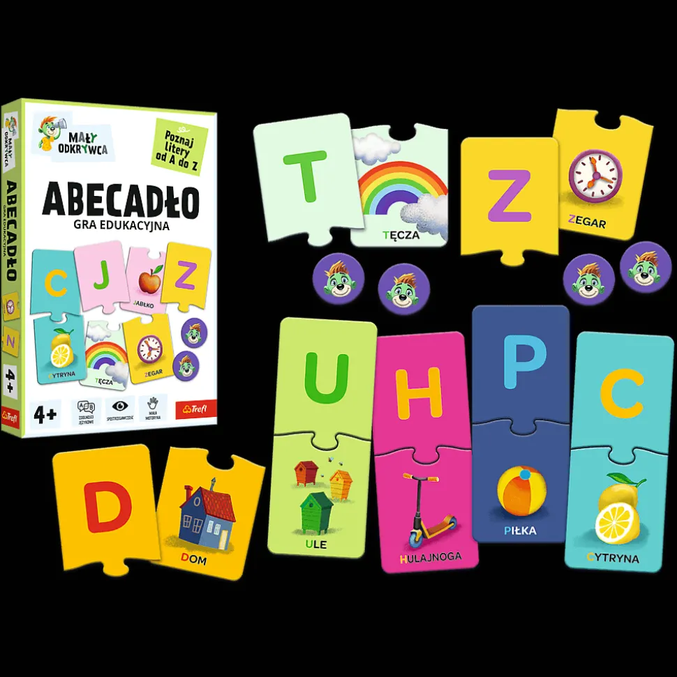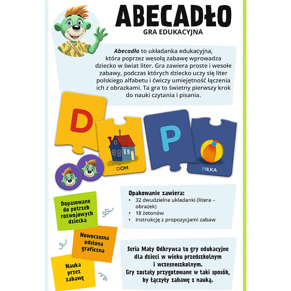 Abecadło to edukacyjna układanka dla przedszkolaków, która w przyjazny sposób wprowadza dzieci w świat liter. Poprzez zabawę maluchy uczą się rozpoznawać litery polskiego alfabetu oraz łączenia ich z obrazkami. To doskonały sposób na połączenie nauki z radością odkrywania alfabetu! Świetny pierwszy krok do nauki czytania i pisania.
