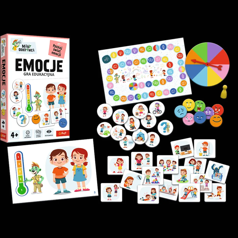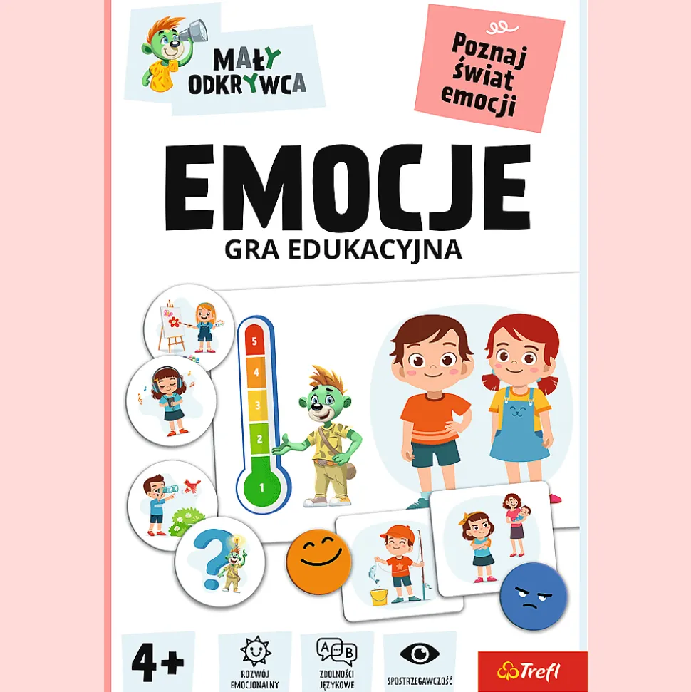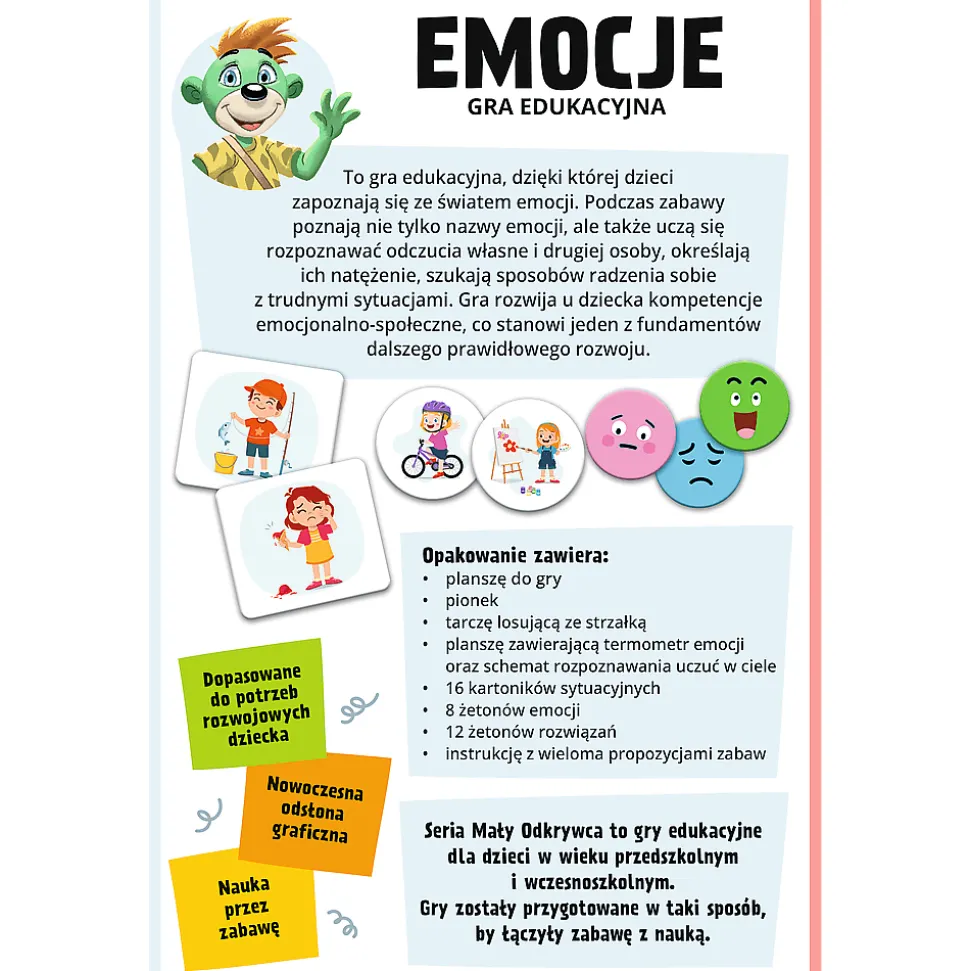 Emocje to edukacyjna układanka dla przedszkolaków, która w przyjazny sposób wprowadza dzieci w poznawania własnych uczuć. Dodatkowo uczą się rozpoznawać odczucia nie tylko swojego, ale też drugiej osoby. Kolorowe ilustracje to dobry wstęp do rozmowy o świecie dziecięcych emocji.