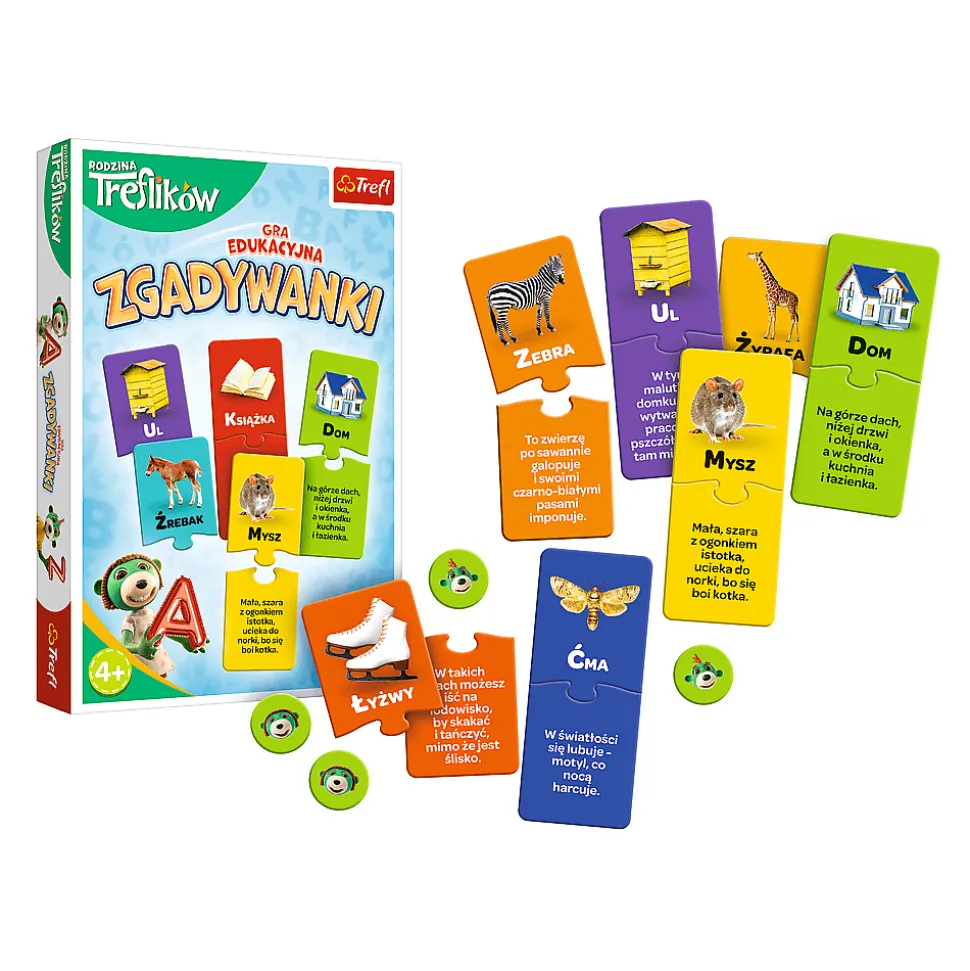 Zagadkowy Alfabet Rodzina Treflików to gra edukacyjna, która poprzez zabawę wprowadza dziecko w świat liter oraz zagadek. Podczas wesołej gry w zgadywanki dziecko poszerza zasób słownictwa, a także rozwija zdolność logicznego myślenia oraz szybkiego łączenia faktów.