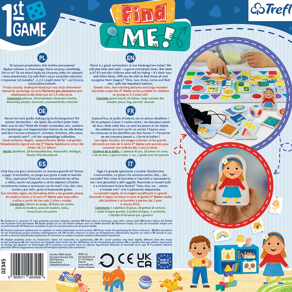 Pierwsza gra planszowa Find Me jest dostosowana dla dzieci już od 2,5 roku życia. Zawiera proste zasady, atrakcyjne ilustracje i duże drewniane elementy.