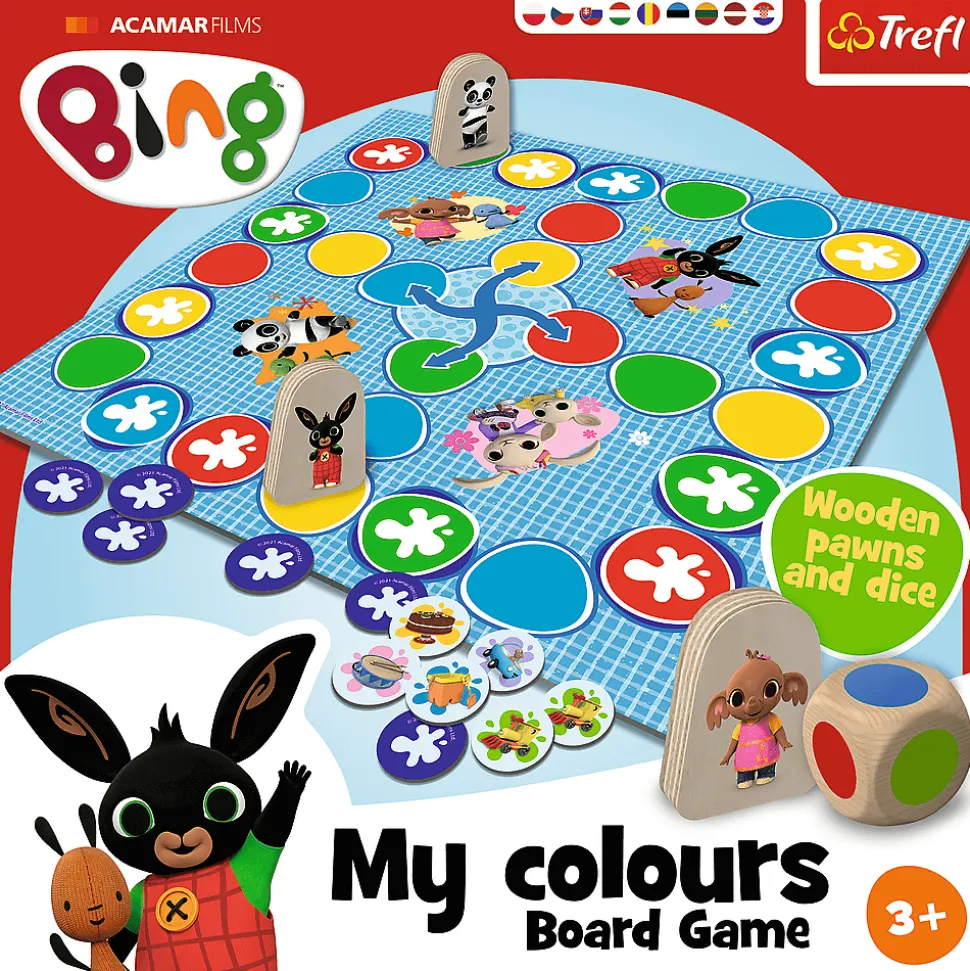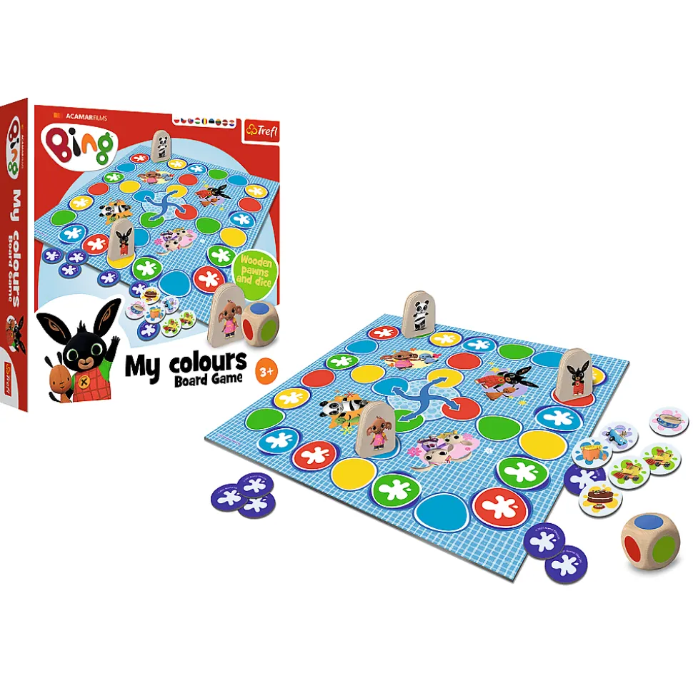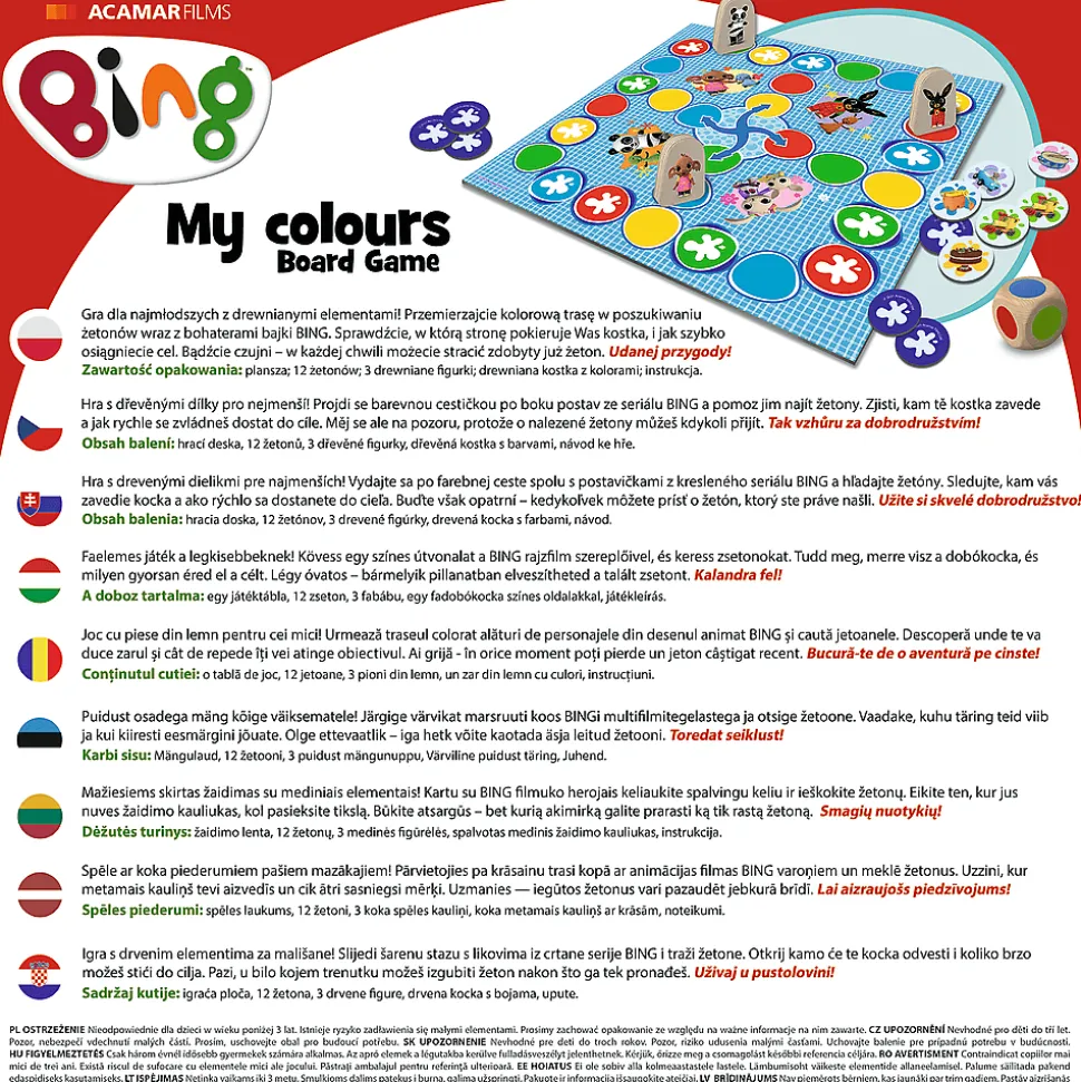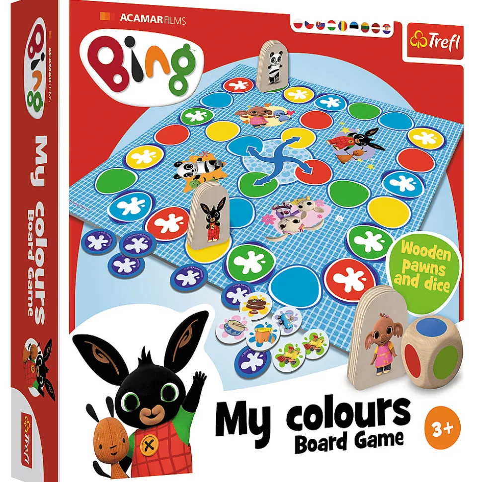 Gra Moje kolory Bing dla najmłodszych z drewnianymi elementami! Przemierzajcie trasę w poszukiwaniu żetonów wraz z bohaterami bajki Bing. Sprawdźcie, w którą stronę pokieruje Was kostka, i jak szybko osiągniecie cel. Bądźcie czujni – w każdej chwili możecie stracić zdobyty już żeton. Udanej przygody!