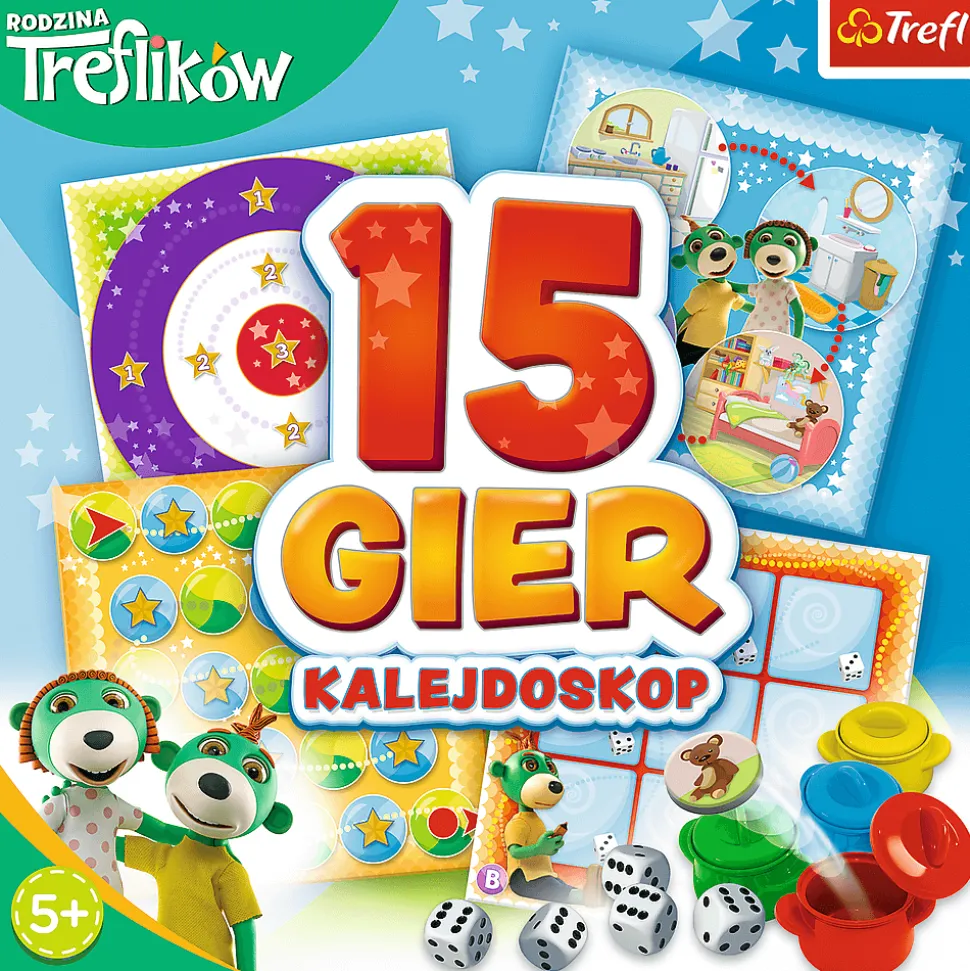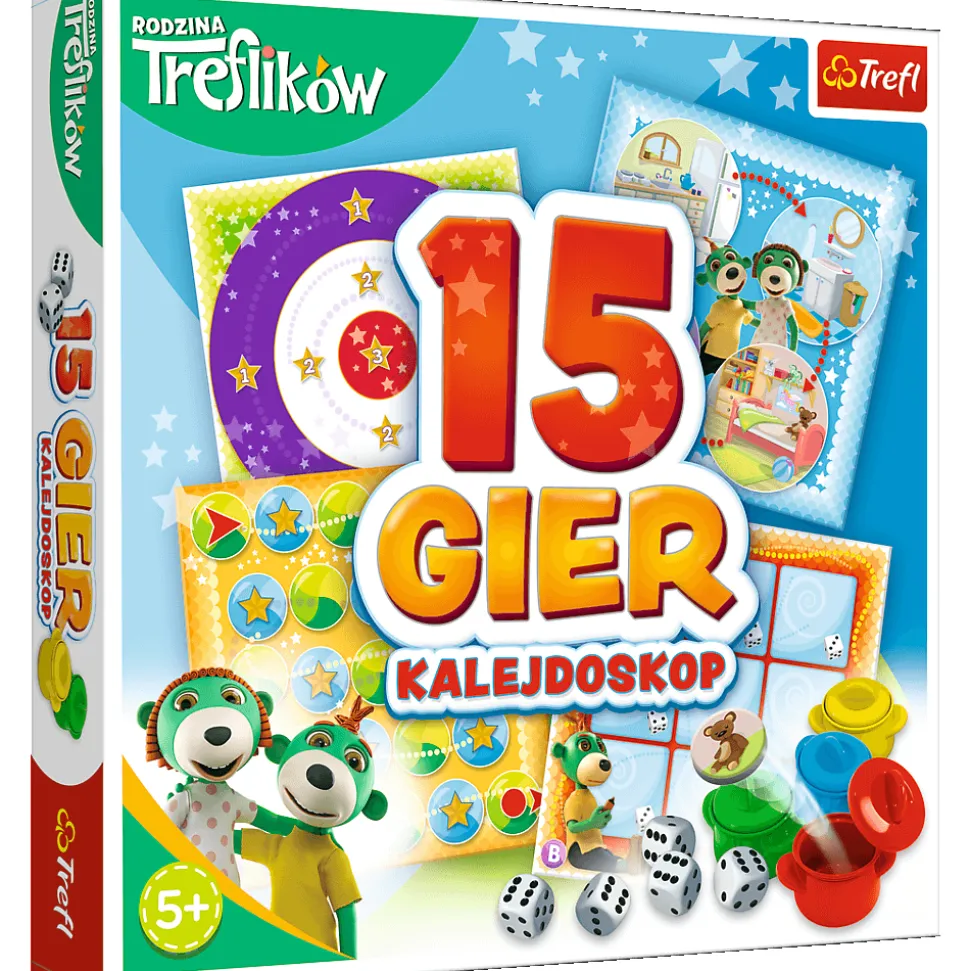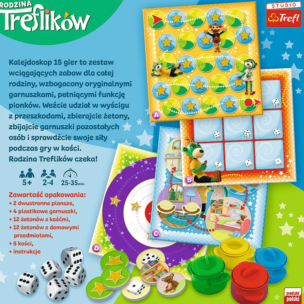 Kalejdoskop 15 gier to zestaw wciągających zabaw dla całej rodziny, wzbogacony oryginalnymi garnuszkami, pełniącymi funkcję pionków. Weźcie udział w wyścigu z przeszkodami, zbierajcie żetony, zbijajcie garnuszki pozostałych osób i sprawdźcie swoje siły podczas gry w kości. Bohaterowie serialu dla dzieci Rodzina Treflików czekają na Was!