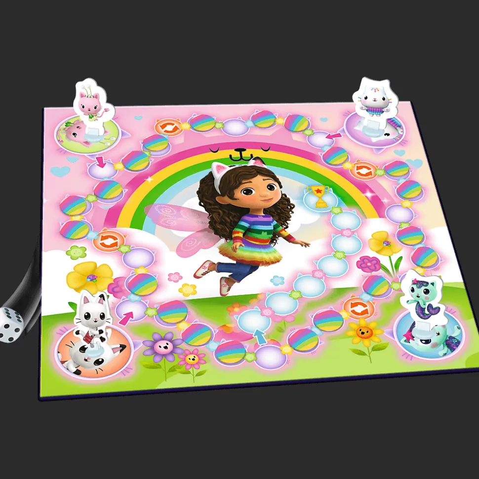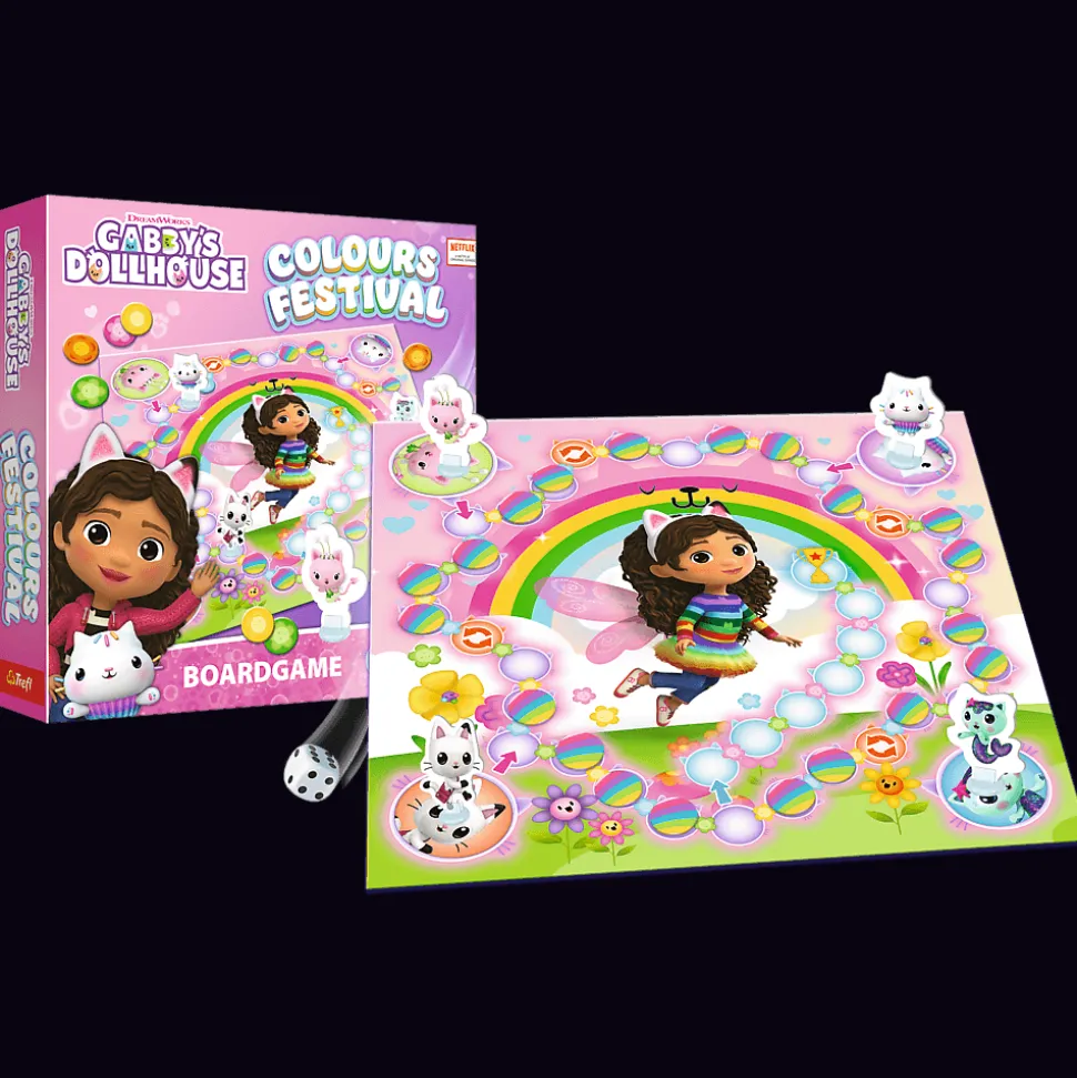 Baw się razem z bohaterami bajki Koci Domek Gabi! Rzucaj kostką i przesuwaj swój pionek tak, aby zebrać żetony we wszystkich 5 kolorach. Taki komplet pozwoli Ci wejść na ścieżkę prowadzącą na Festiwal Kolorów, gdzie czeka już na Ciebie Gabi. Wyprzedź przeciwników i dotrzyj tam, jako pierwszy.