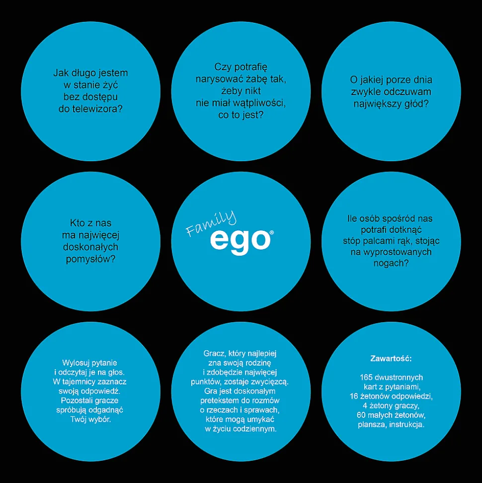 Sprawdź, czy dobrze znasz swoją rodzinę! Ego Family to popularna gra towarzyska w rodzinnej odsłonie. Wyciągnij kartę z jednym z 330 niebanalnych pytań i wybierz odpowiedź.